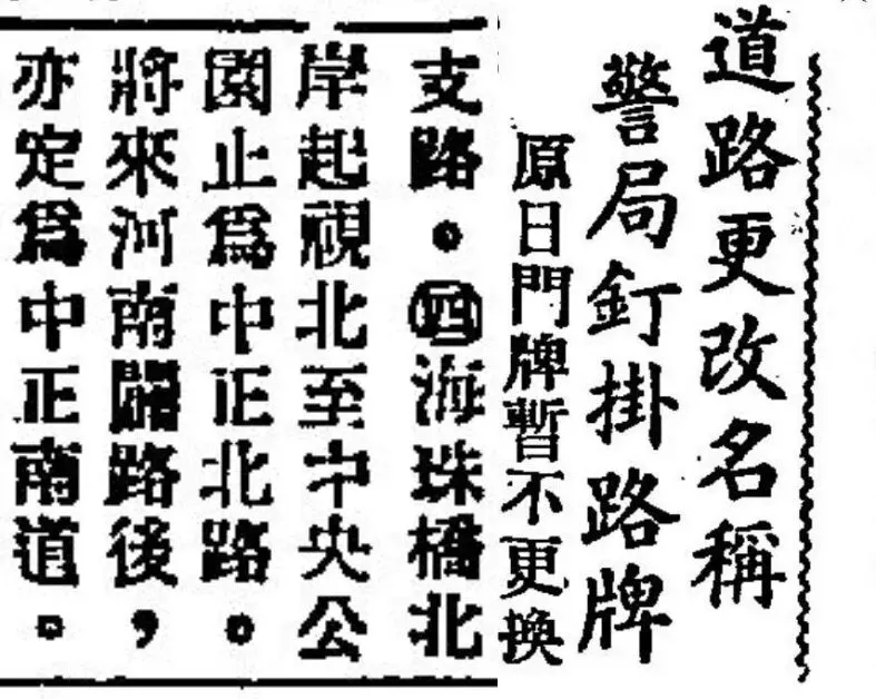 相关部门建议,维新北路和南路改为中正北路,海珠桥改为中正桥,桥以南开辟河南主干道,命名为中正南路。