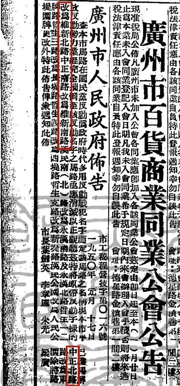 1950年1月17日,广州市人民政府发出布告,将以发动战犯命名的道路改名,以正视听。作为头号反动战犯的中正路首当其冲。中正北路复名为维新北路,中正南路复名为维新南路。