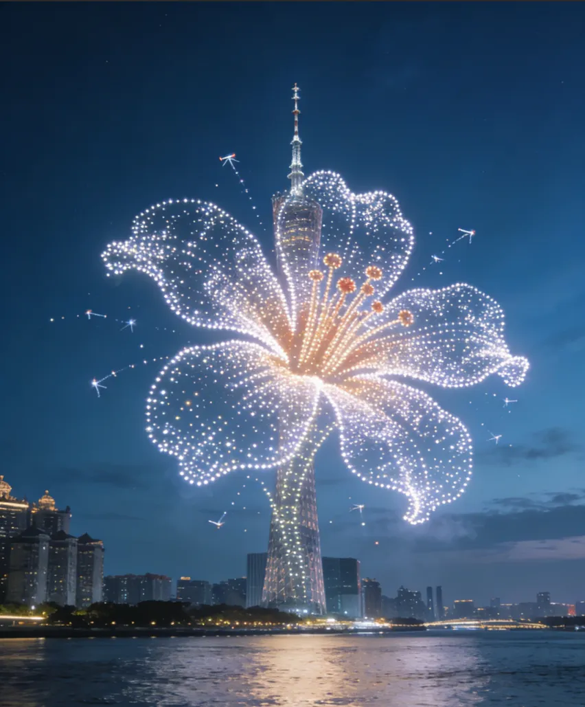夜幕降临,城市轮廓被温柔点亮。不同于传统烟花稍纵即逝的绚烂,无人机编队以精准的轨迹与默契的编排,将瞬间凝练成诗。它们不是转瞬即逝的光火,而是带着叙事野心的空中画笔,在数百米高空徐徐铺展一幅幅流动的画卷。从岭南花窗的细腻纹路,到珠江波光的粼粼倒影;从千年商都的历史剪影,到未来城市的科幻构想——每一帧画面,都是广州写给世界的立体情书。