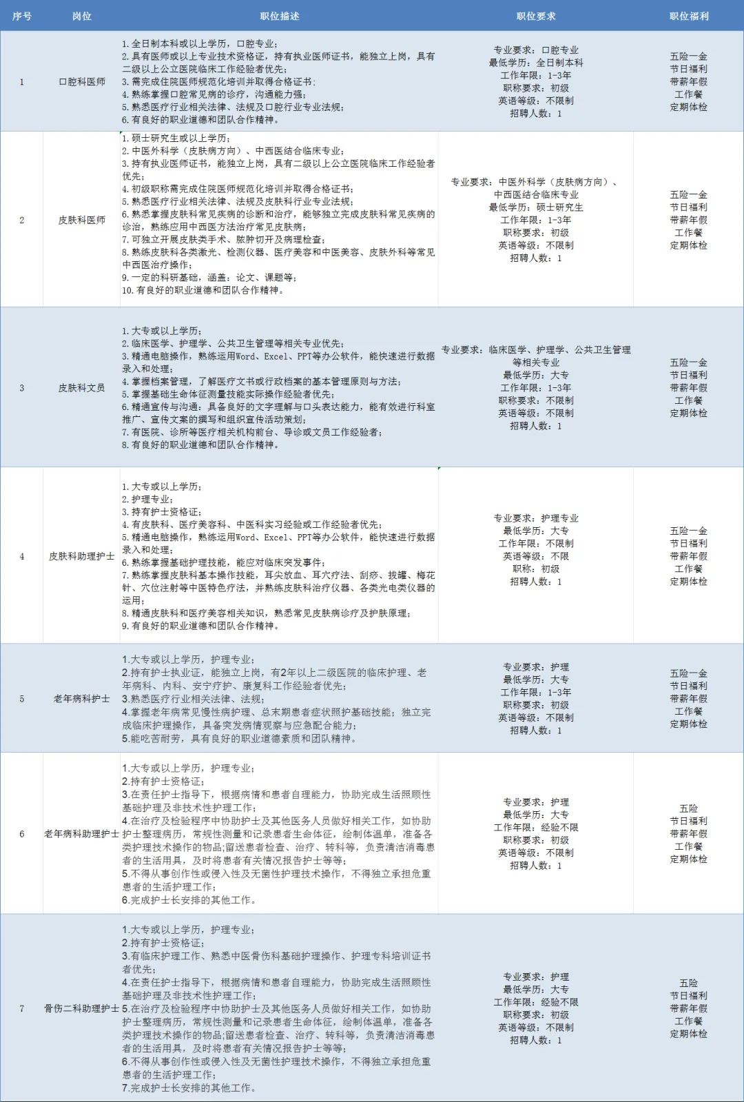因医院业务发展需要,现需招聘合同制口腔科医师1名、皮肤科医师1名、皮肤科文员1名、皮肤科助理护士1名、老年病科护士1名、老年病科助理护士1名、骨伤二科助理护士1名。