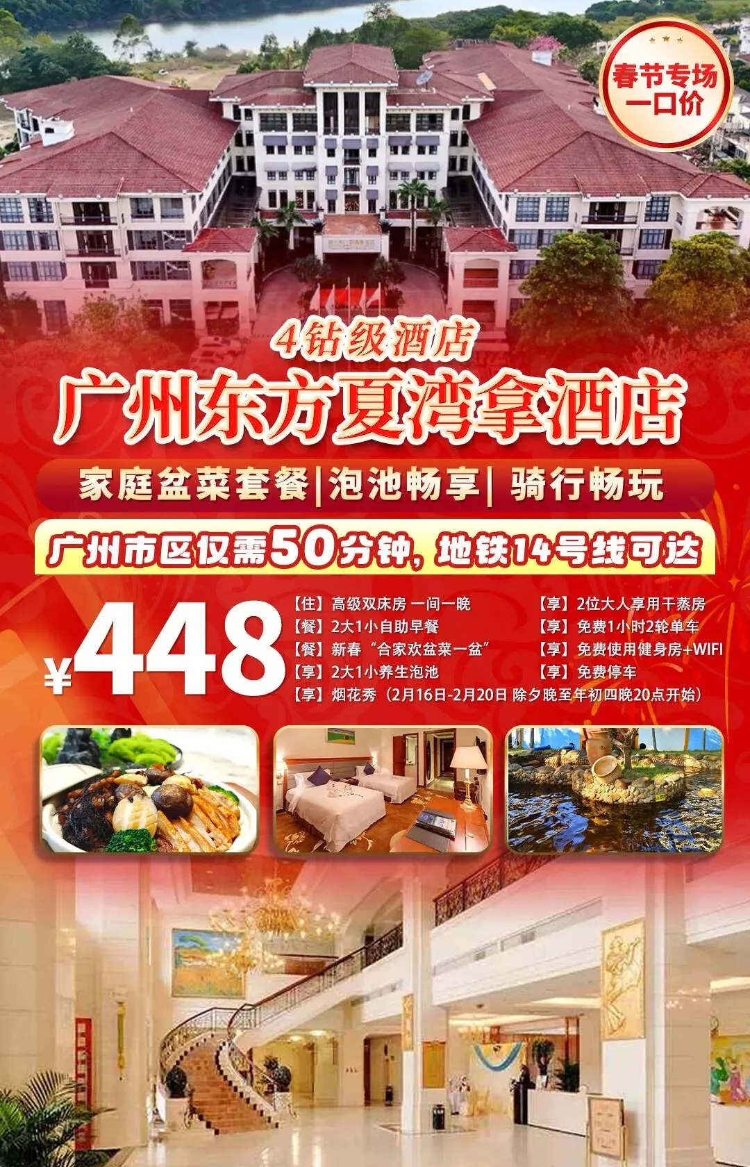 购买须知新春盆菜住房套餐.使用方式:在线预约:线上购买>收到短信>在线预约.抢购日期:即日 至 2026.02.22.使用日期:套餐内容新春盆菜住房套餐抢购价:¥448元.新春盆菜住房套餐.【住】高级双床房 一间一晚1份¥499.【餐】2大1小自助早餐(1小为 1.4 米以下儿童,下同)1份¥199.【餐】新春“合家欢盆菜一盆”(米饭茶位另计)1份¥299.【餐】2大1小养生泡池1份¥99.【玩】2位大人享用干蒸房1份¥99.【享】免费1小时2轮单车1份¥1.【享】烟花秀(2月16日-2月20日 除夕晚至年初四晚20点开始)1份¥1.【享】免费使用健身房1份¥1.【享】免费 WIFI1份¥1.【享】免费停车1份¥1适用门店广州东方夏湾拿酒店广东省广州市从化区太平镇夏湾拿大道1号020-37993999使用说明: