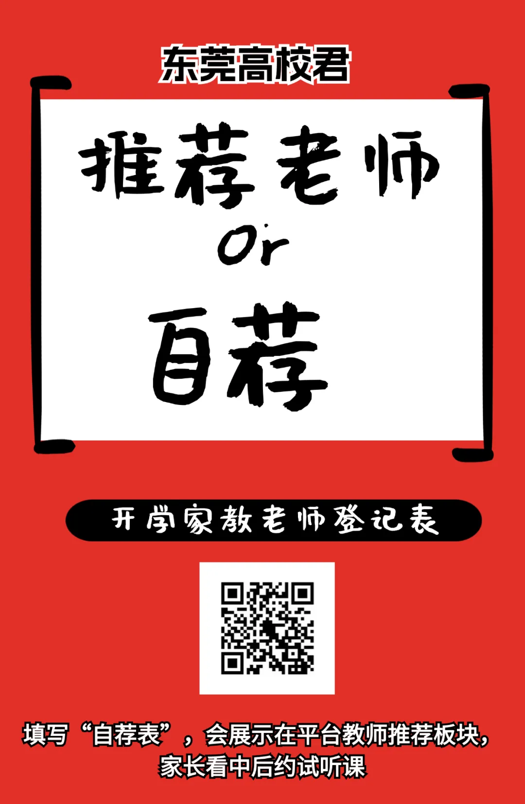 若您家教经验丰富或者教学能力强,可以联系东莞大师姐填写家教自荐表,师姐帮忙向家长们优先推荐的哦!或者展示在教师推荐板块。