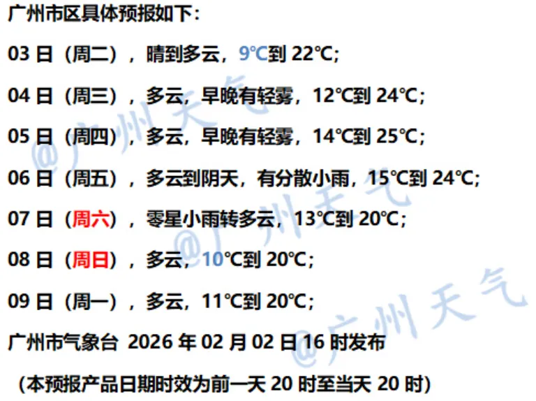 2月2-3日,雷州半岛多云间阴天,其余大部分市县晴到多云。最低气温:粤北、珠三角北部市县4~8℃,粤西市县12~17℃,其余市县8~12℃。