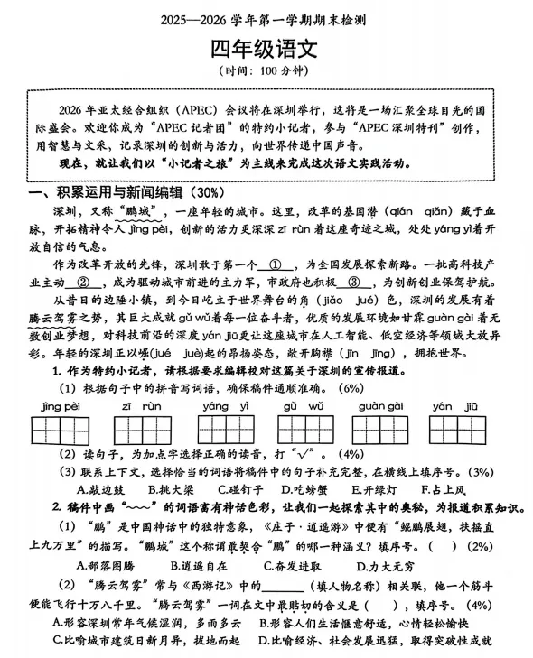 2026年深圳市南山区四年级上册语文期末试卷(第1页/共6页)