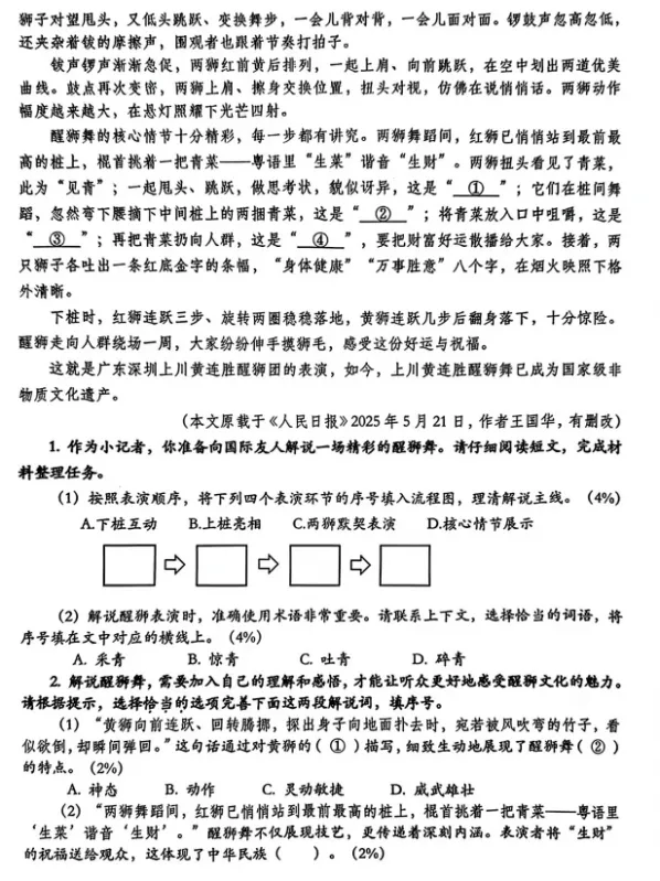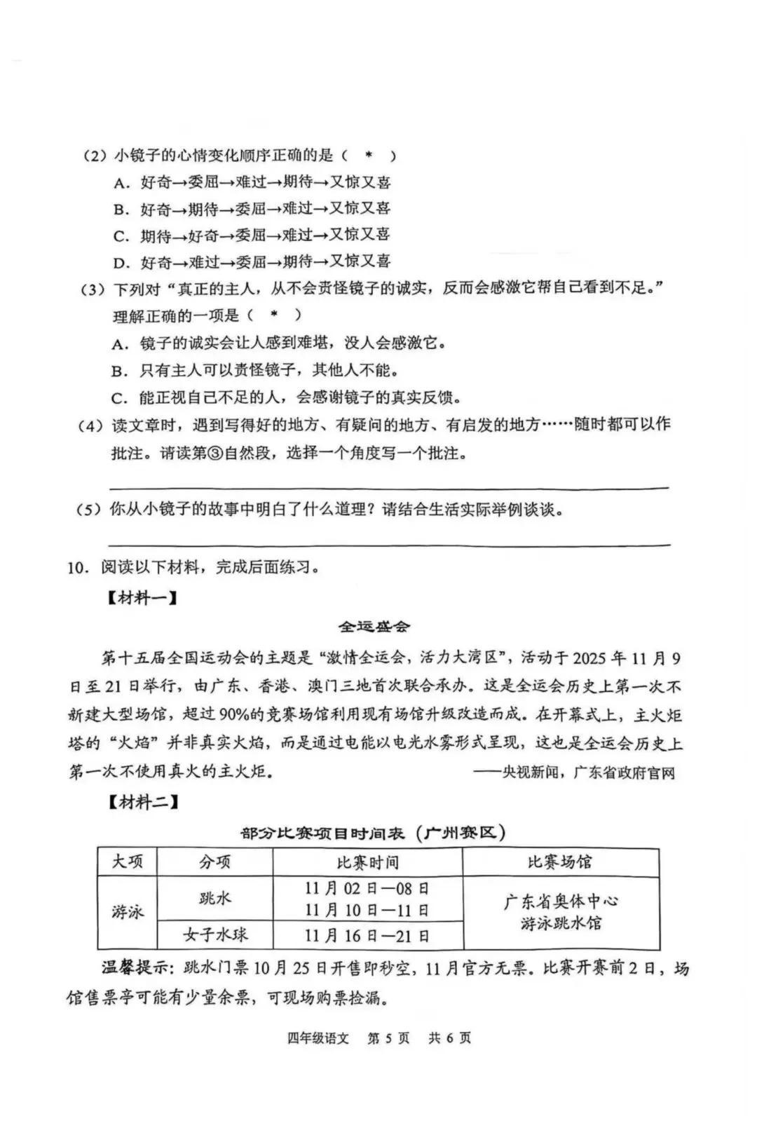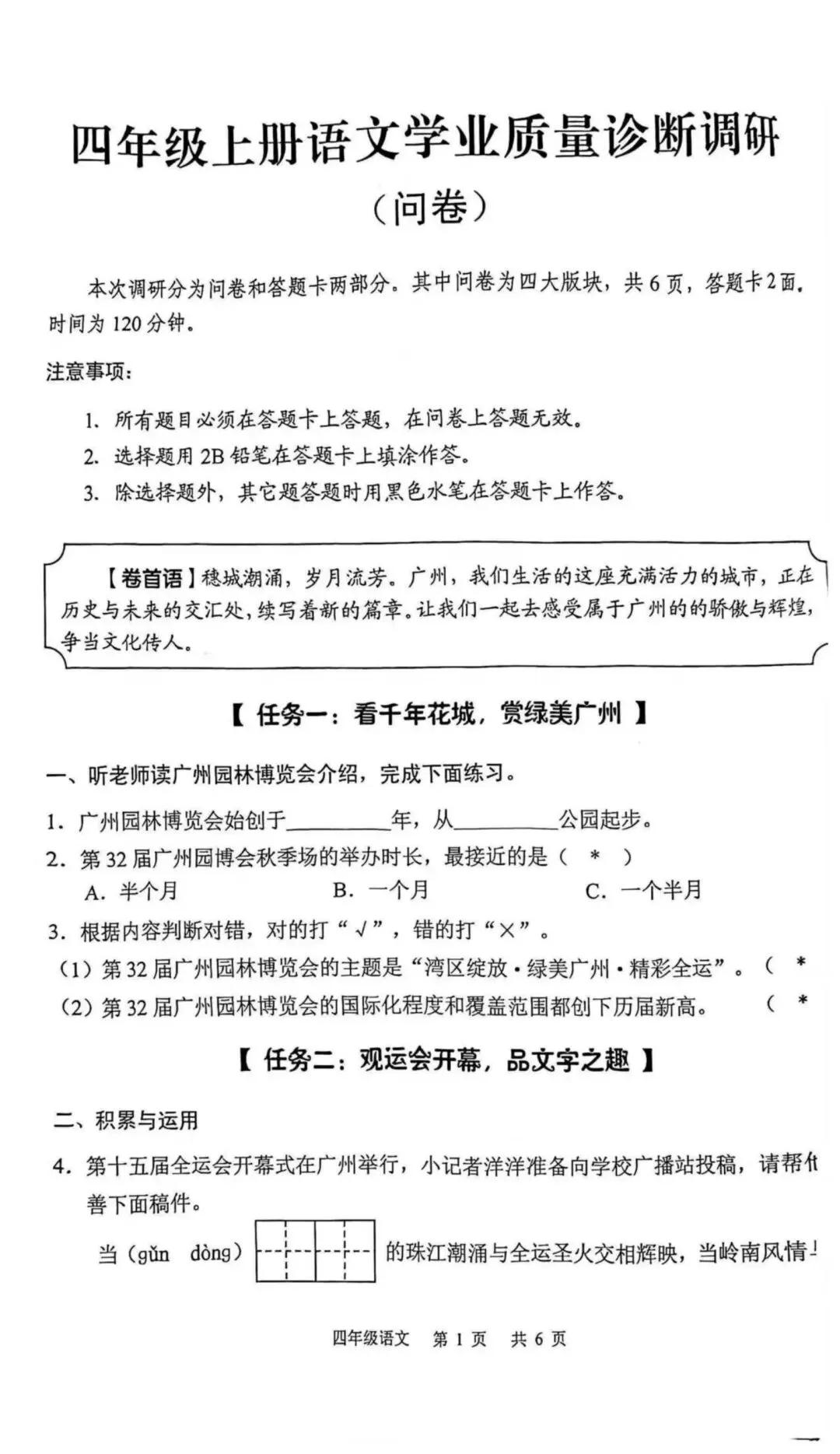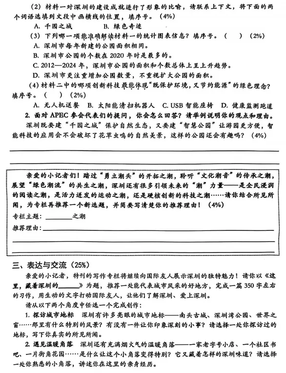 仅从文字编排和篇幅上来看,就远不如深圳卷,且考查范围基本上是课本大纲内的,阅读考了2025年举办的全运会,作文写自己熟悉的大广州,可写的范围也很宽,难度不算大。