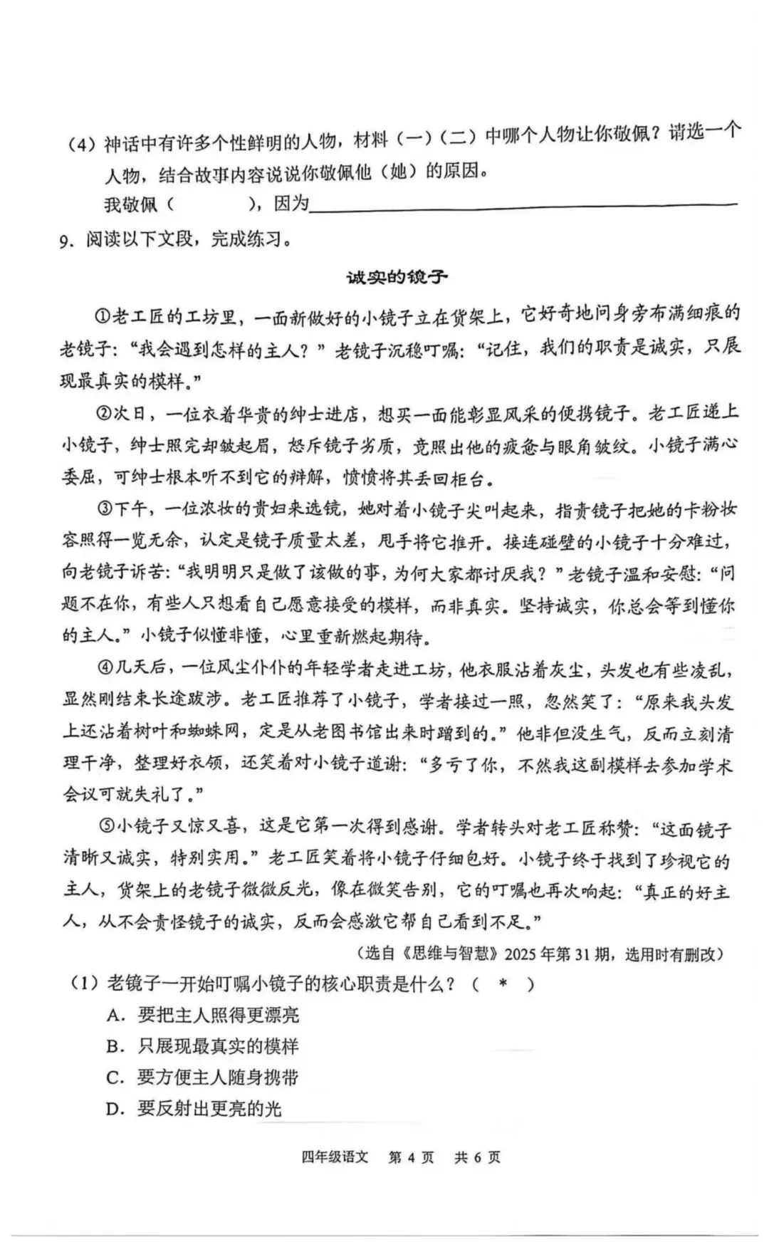 2026年深圳市南山区四年级上册语文期末试卷(第4页/共6页)