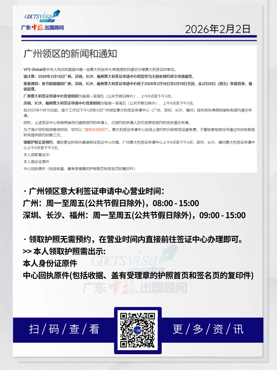 意大利签证申请中心官网发布消息:!!请注意:2026年2月13日,广州、深圳、长沙、福州意大利签证申请中心将暂停当天的免预约递交申请服务。>>消息回顾:自2025年11月10日起,每个工作日下午1点到3点广州领区意大利签证申请中心(广州、深圳、长沙、福州)按先到先得原则接收免预约递交申请。春节假期通知:春节假期期间,广州、深圳、长沙、福州意大利签证申请中心将于2026年2月16日至2月19日关闭,从2月20日(周五)恢复营业,敬请留意。