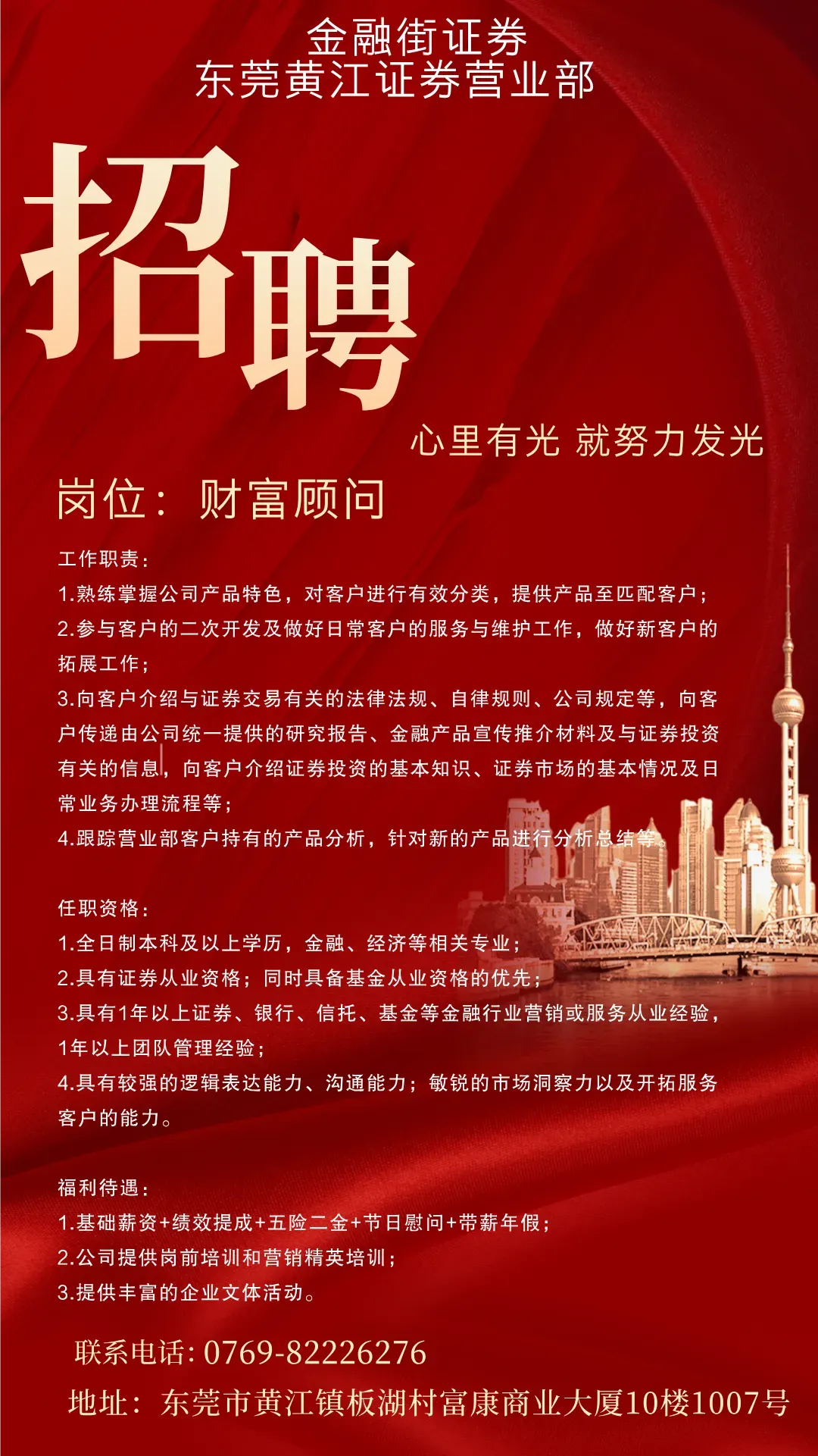 【东莞招聘】金融街证券东莞黄江营业部招聘啦!五险二金、带薪年假等福利,期待您的加入!