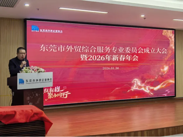 2026年1月30日,东莞市外贸综合服务专业委员会成立大会暨东莞市外贸企业协会2026年新春年会在东莞东城智汇谷圆满举行。东莞市商务局领导、东莞市外贸企业协会会员企业代表齐聚一堂,共同见证专委会的诞生,开启东莞外贸综合服务发展的新篇章。