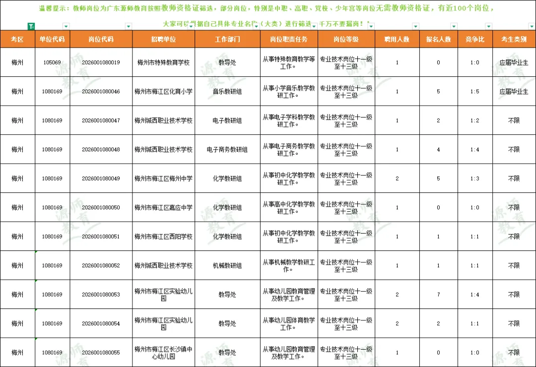 截止2月2日16:00,小编给大家整理了2026广东省集中招聘各考区教师岗的报名情况,包括竞争比和无人报考岗的情况,下方一起来了解一下吧!截止2月2日下午16:00,教师岗共4006人报名,平均竞争1:1。从中可见广州地区竞争最大,竞争比为1:10.2;梅州、湛江和汕头等三地报名人数较多,分别已报名783人、781人和738人。具体详情查看下方各地报名人数及竞争比↓ 截至2月2日下午16时,共1036个教师岗无人报名。其中湛江347人,梅州270人,汕头135人教师岗无人报考。 东莞本身仅有13个编制,竞争比最终将异常激烈,上岸程度和性价比考虑,梅州第一、汕头第二、江门第三,湛江第四。 梅州教师性价比高,东莞高铁自驾过区都不错,重点是进面分超低,其次汕头,交通方便,江门竞争比高,湛江太远。 全省各地单位已报名情况如下图所示↓,完整表格可添加陈老师回复 集中招聘 进群获取。2020-2025年6年真题及答案