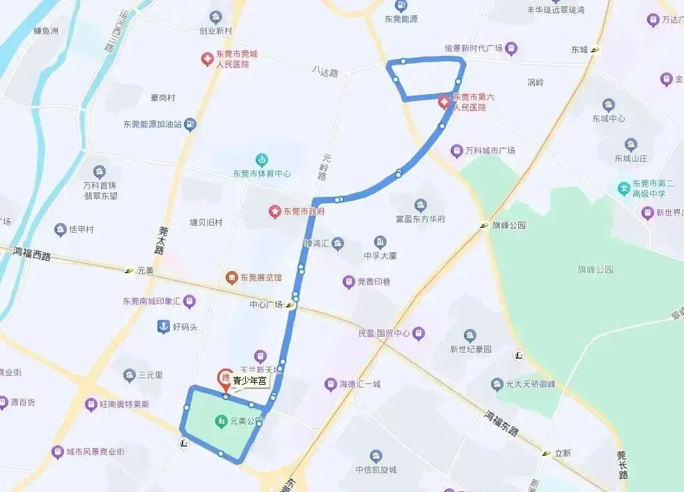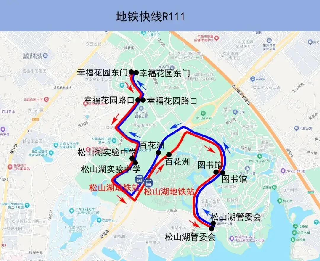 幸福花园东门、幸福花园路口、松山湖实验中学、松山湖地铁站、百花洲、图书馆、松山湖管委会、松山湖管委会、图书馆、百花洲、松山湖地铁站、松山湖实验中学、幸福花园路口、幸福花园东门。