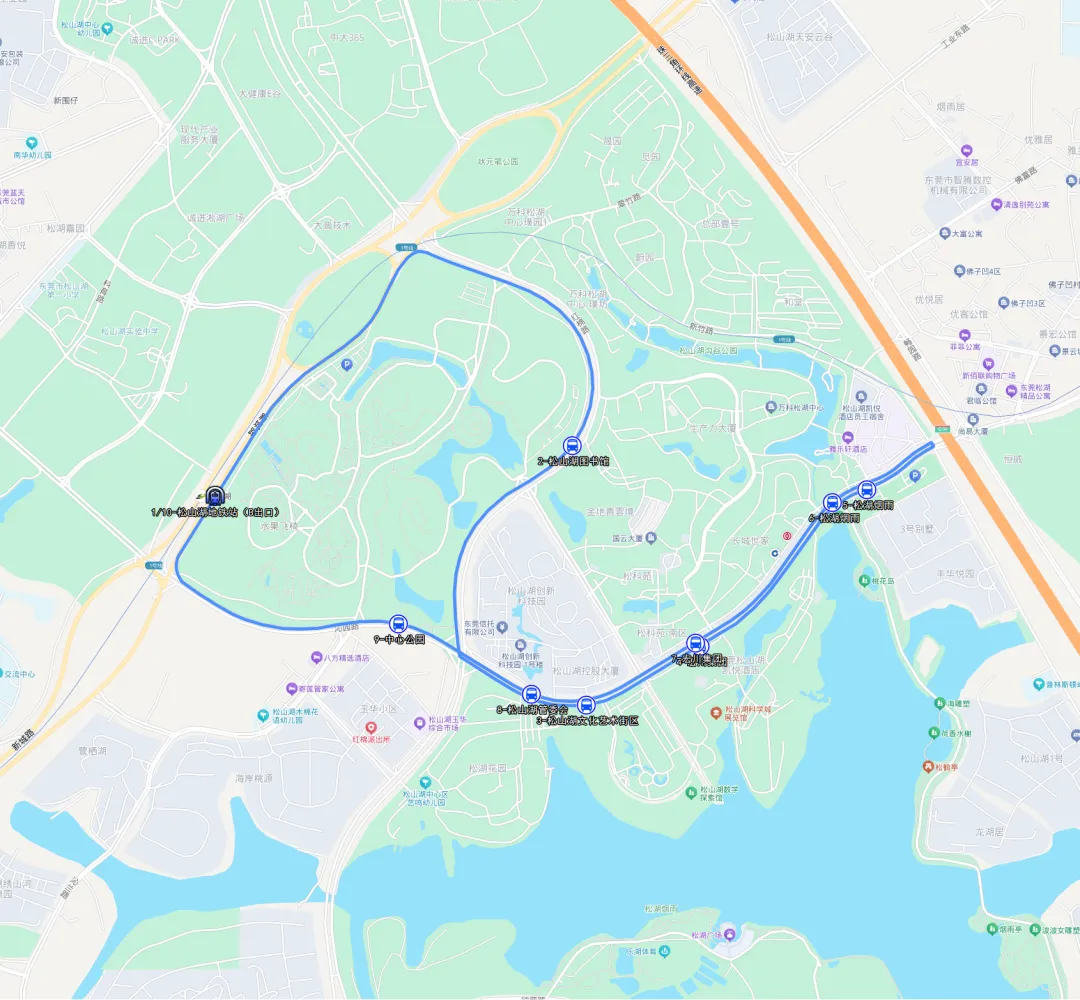 上行站点:松山湖文化艺术街区(悠兰里)、松山湖地铁站、百花洲、城际松山湖北站(D口)