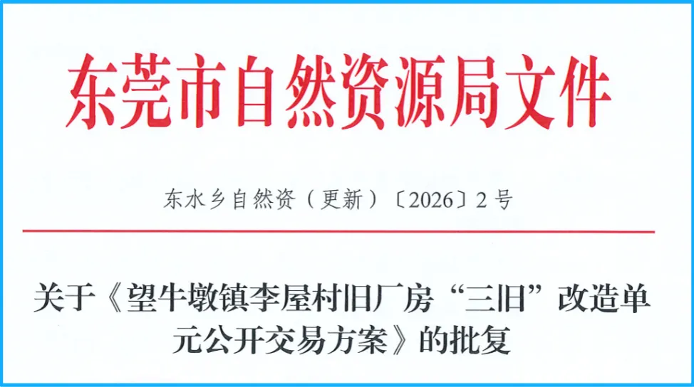 近日,东莞市自然资源局正式批复《望牛墩镇李屋村旧厂房“三旧”改造单元公开交易方案》。
