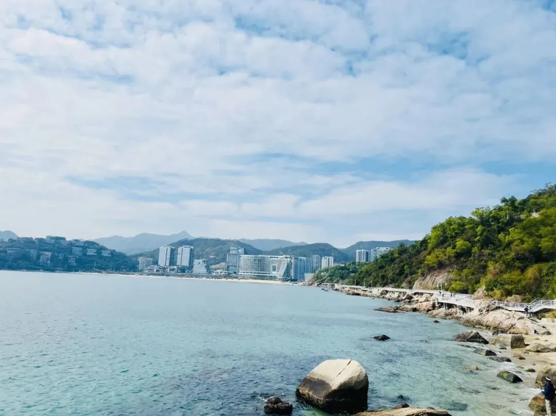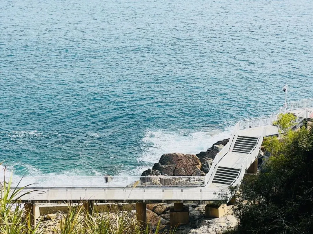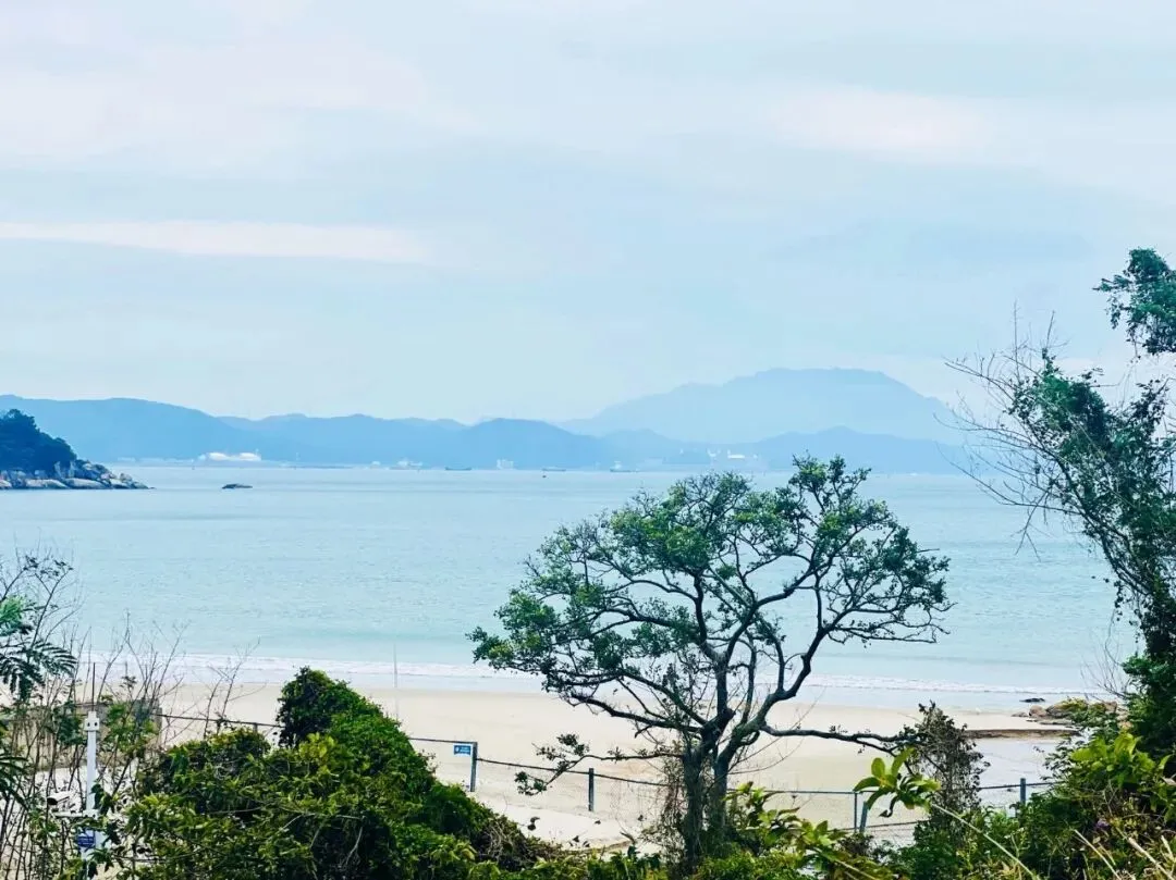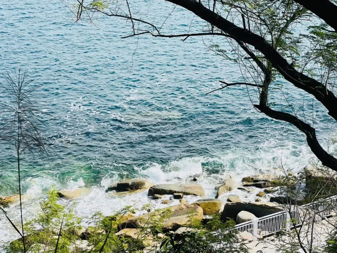 不同于热门海滨的喧嚣,溪涌的海岸线静谧而舒展,深圳“山海连城”的肌理在此清晰可见:左侧是郁郁葱葱的山林,植被繁茂得能听见鸟鸣虫吟,呼吸间满是草木与海盐混合的清新;右侧是波澜不惊的大鹏湾,风不大,仅能看见微波轻漾时泛起的细碎金光,海浪拍击礁石的声响柔和得像自然的白噪音,完全不会打乱徒步的节奏。