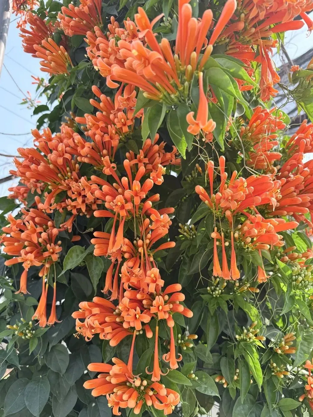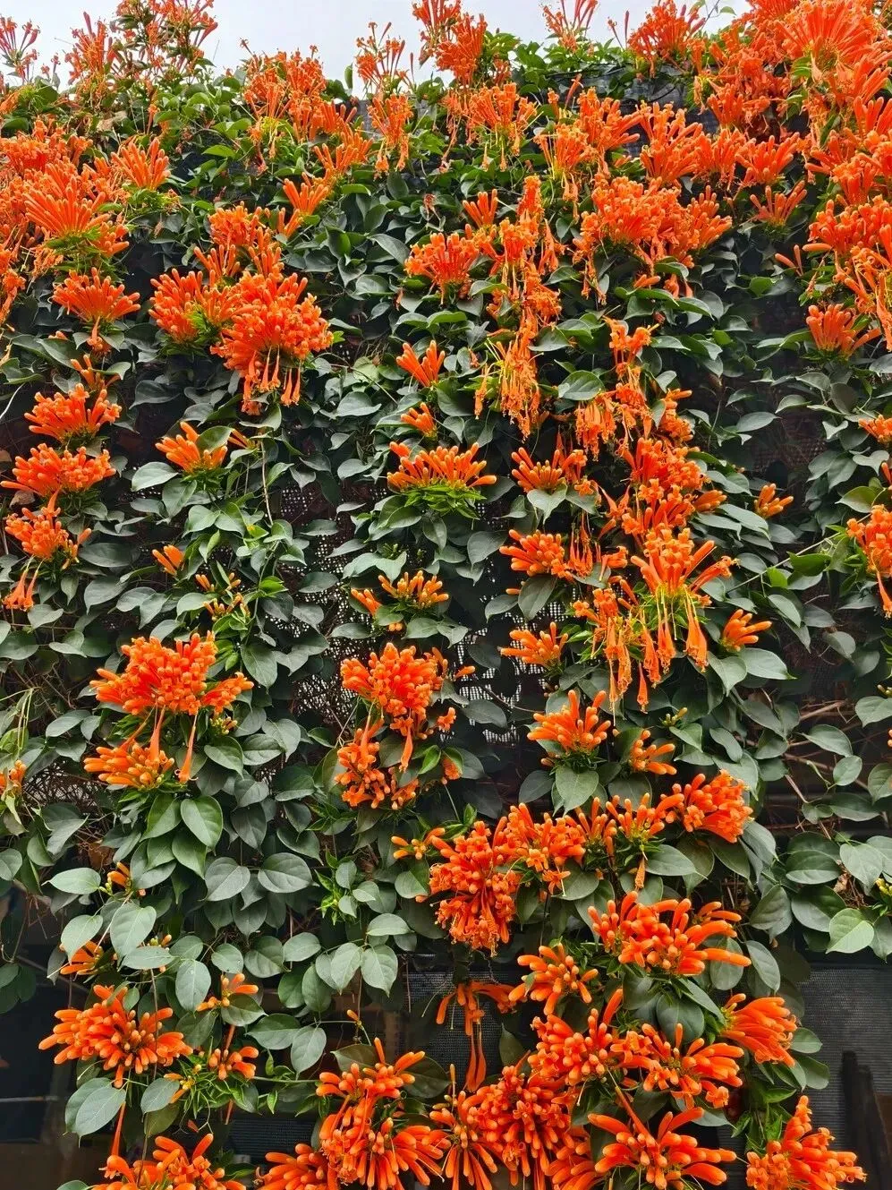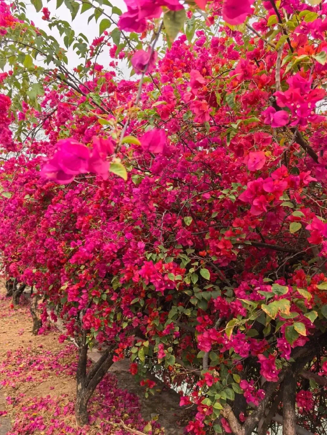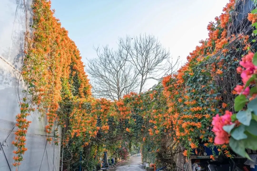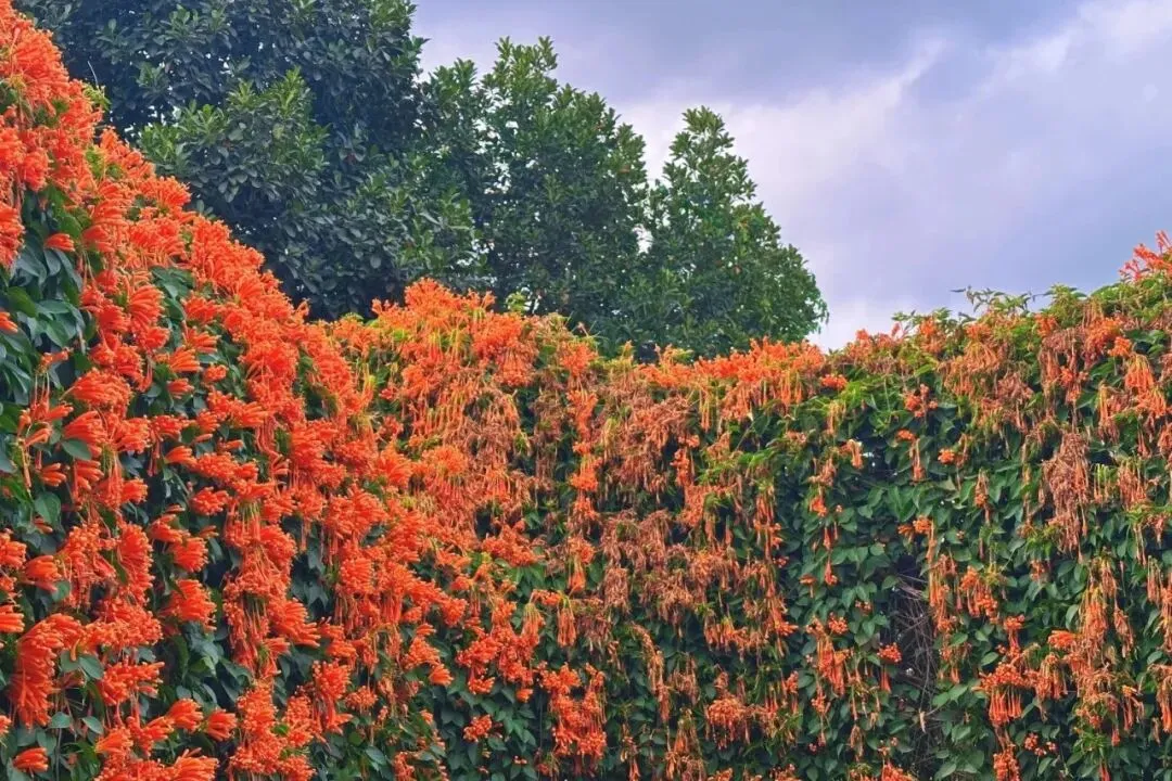 一整个被惊艳到!满墙的橙红色花朵像瀑布一样倾泻而下,仿佛走进了童话世界,美到让人窒息!密密的花穗挨挨挤挤,从围墙上泼洒下来,午后光线下泛着金箔般的色泽,层层叠叠的橙红色像点燃的鞭炮,噼里啪啦,炸开一整个春天的热闹。走近细看,每一朵小花都似精巧的铃铛,在微风里轻轻摇曳,空气中也浮动着暖融融的、淡淡的甜香。“炮仗花”因其成簇盛放,形如串串炸开的鞭炮,橙红似火,故得名。可以乘坐地铁 3 号线五山站 A 口,步行到西南门进校。来这里需要提前预约,在「华南农业大学」预约入校,自驾无需预约,西门自动抬杆。进入校园后,可导航至林学与风景园林学院。找到黄色石头斜对面的园艺教学实验基地,从那里向左转,再一直向前走便能遇见。那里有好几面茂盛的炮仗花墙,开得热烈又张扬。橙红的花串从二楼垂泻至地,阳光穿过时,花瓣宛如被镀上金光。风来时,整面花墙轻轻摇曳,仿佛一串串即将被点燃的鞭炮,氛围感瞬间满格。难得的是,花墙前空地开阔,不必争抢机位,无论是独自留影,还是与友人、爱人合照,都能从容自在。另一处宝藏藏在园艺实验基地旁——那是一条由炮仗花交织而成的“隧道”。从林学院花墙左转约50米即可到达。这里花串更为密集,形成了一条绚烂的橙红色长廊。走入其中,仿佛跌进花的迷宫,低头是散落的花瓣小径,抬头是满眼流动的橙红,拍背影或侧影,格外有故事感。除了热烈的炮仗花,校园里还有温柔的三角梅可赏。湖边的开得尚稀落,更推荐导航至竹园餐厅,步行十来分钟,便能邂逅一整面娴静的三角梅花墙。不妨带上一本书作为道具,低头阅读,或抬头看花,时光在此刻变得缓慢而诗意。这个春天,若你想寻找一场不被打扰的、浓墨重彩的花事,华农的炮仗花,正开得恰到好处。它不声张,却足够灿烂;不设限,只为等待懂得欣赏的眼睛。您的鼓励,是对我最大的支持!