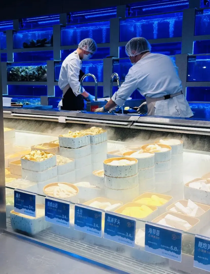 一到店就被门头惊到,和海底捞经典的红白色调不同,这家店主打蓝色系,科技感拉满,仿佛一秒潜入深海,店内装修更是绝绝子,满眼的深蓝、浅蓝元素,搭配海底主题的装饰,坐在里面吃火锅,就像在“海底用餐”一样,氛围感直接拉满!