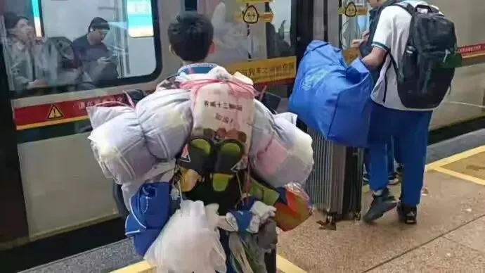 照片中,初二年级学生何梓睿背着几乎与身高齐平的“小山包”行李独自候车,被褥、蚊帐等生活用品被整齐打包成简易背囊,一手稳稳提着行李箱,瘦小的身躯挺得笔直,步伐沉稳有力。这一幕被网友拍下后,迅速收获百万点赞,#广州小孩哥最强背影# 话题登上热搜,评论区满是“这才是少年该有的模样”“小小肩膀扛起的是独立与担当”的赞叹。