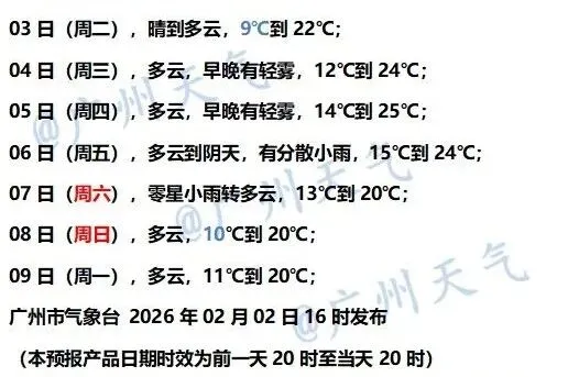 2月5日,西部市县多云到阴天,局部有小雨,其余市县多云到晴,全省大部早晚有轻雾或雾。最低气温:粤北、珠三角北部市县9~13℃,粤西沿海市县16~21℃,其余市县13~16℃。