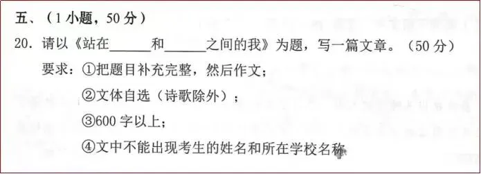 这是一个通过二元对立的概念框架展现个人思考的题目,重点在于“我” 的立场与选择,所填的两个词必须形成辩证关系,比如 “新旧”“得失”“理想与现实”“个体与群体”“科技与人文” 等。特别要注意的是,千万不要填并列关系,如“父母之间”。