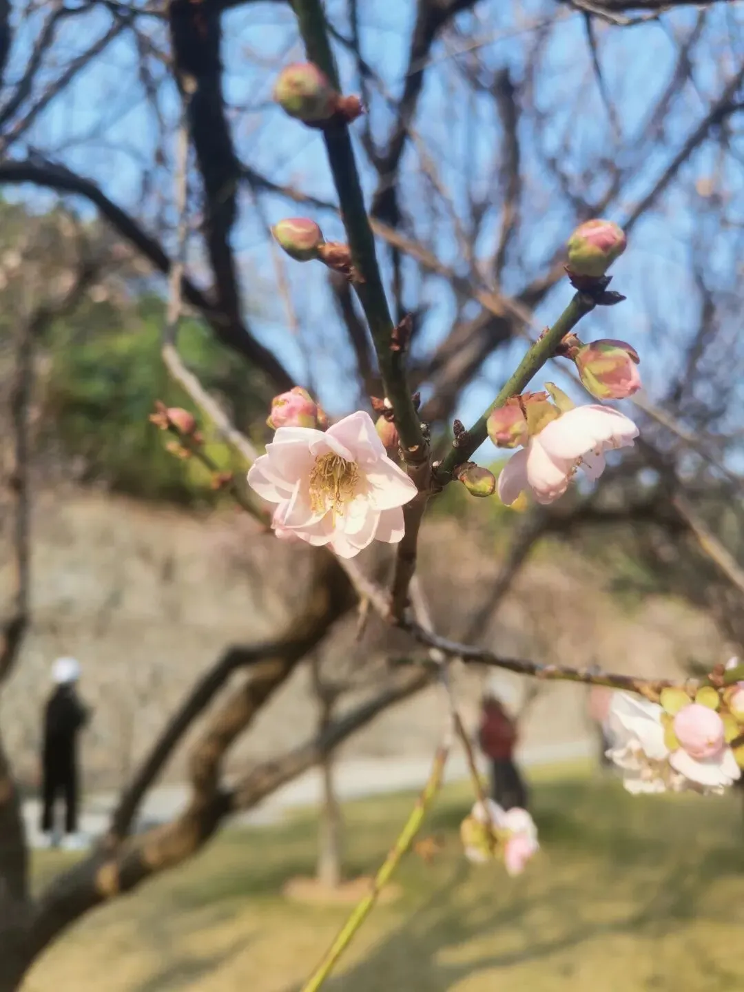 这颗梅花树前拍摄的人是最多的,在蓝天的衬托下,淡绿色的花儿格外漂亮!