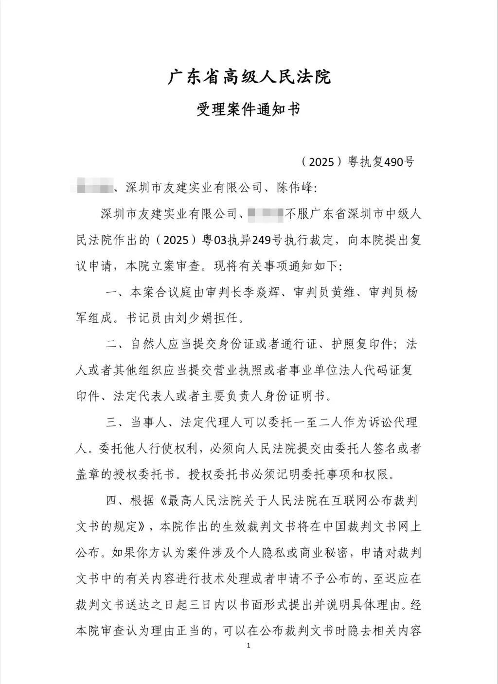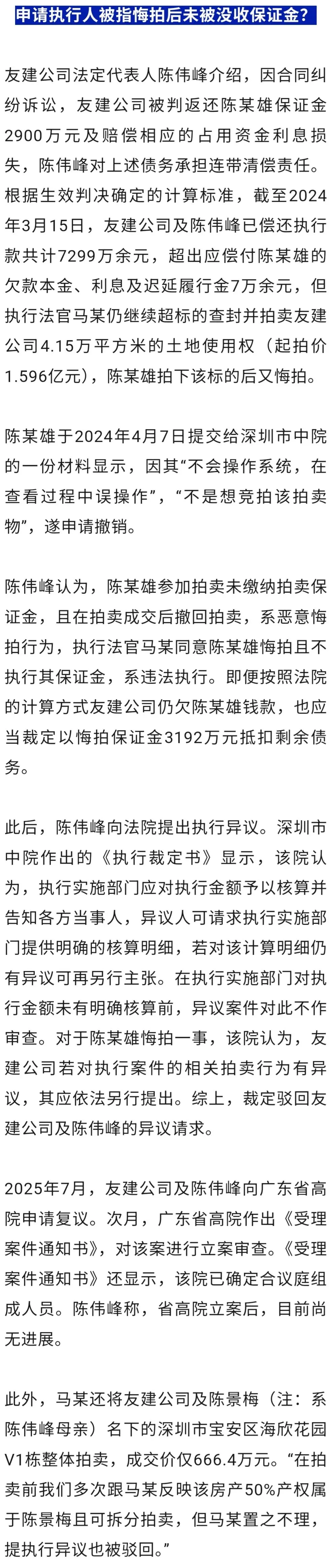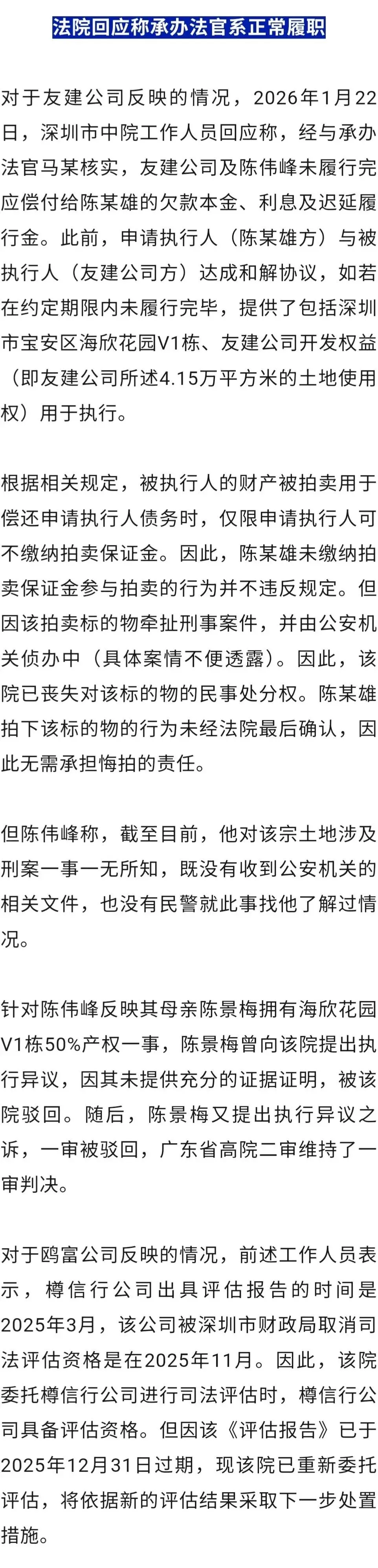针对友建公司反映的情况,2026年1月22日,深圳市中院工作人员回应记者称,经向承办法官马某核实,陈伟峰未清偿完毕。涉案标的因牵扯一起刑事案件,该院已无处分权,因此申请执行人悔拍亦无需承担相应责任。对于鸥富公司反映的情况,该工作人员表示,该院委托樽信行公司进行评估时,该公司尚未被深圳市财政局取消司法评估资格。由于樽信行公司作出的《评估报告》已过有效期,该院已重新委托评估,将依据新的评估结果采取下一步处置措施。