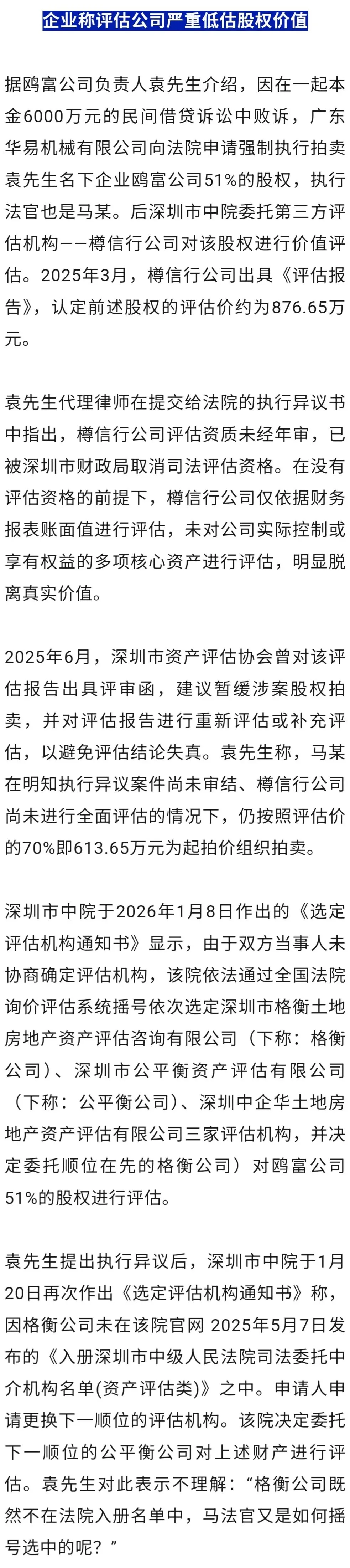 2026年1月26日,法官马某继续发出协助评估通知书(2025)粤03执恢228号之四,继续强行指定深圳市公平衡资产评估有限公司进行评估。袁先生多次反映要求双方摇号选定评估公司并呼吁深圳中院重视确保公正执法。