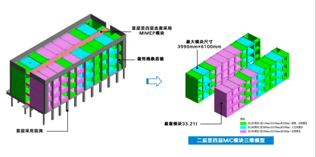 深化设计阶段,项目创新践行“标准化设计、工厂化生产、装配式施工、一体化装修、数字化管理”五位一体模式,依托BIM技术实现全专业协同。通过三维可视化呈现模块内部连接节点、预埋管线排布及装修效果,保障施工精准度。