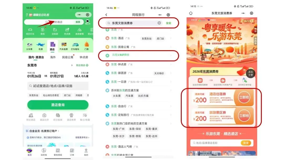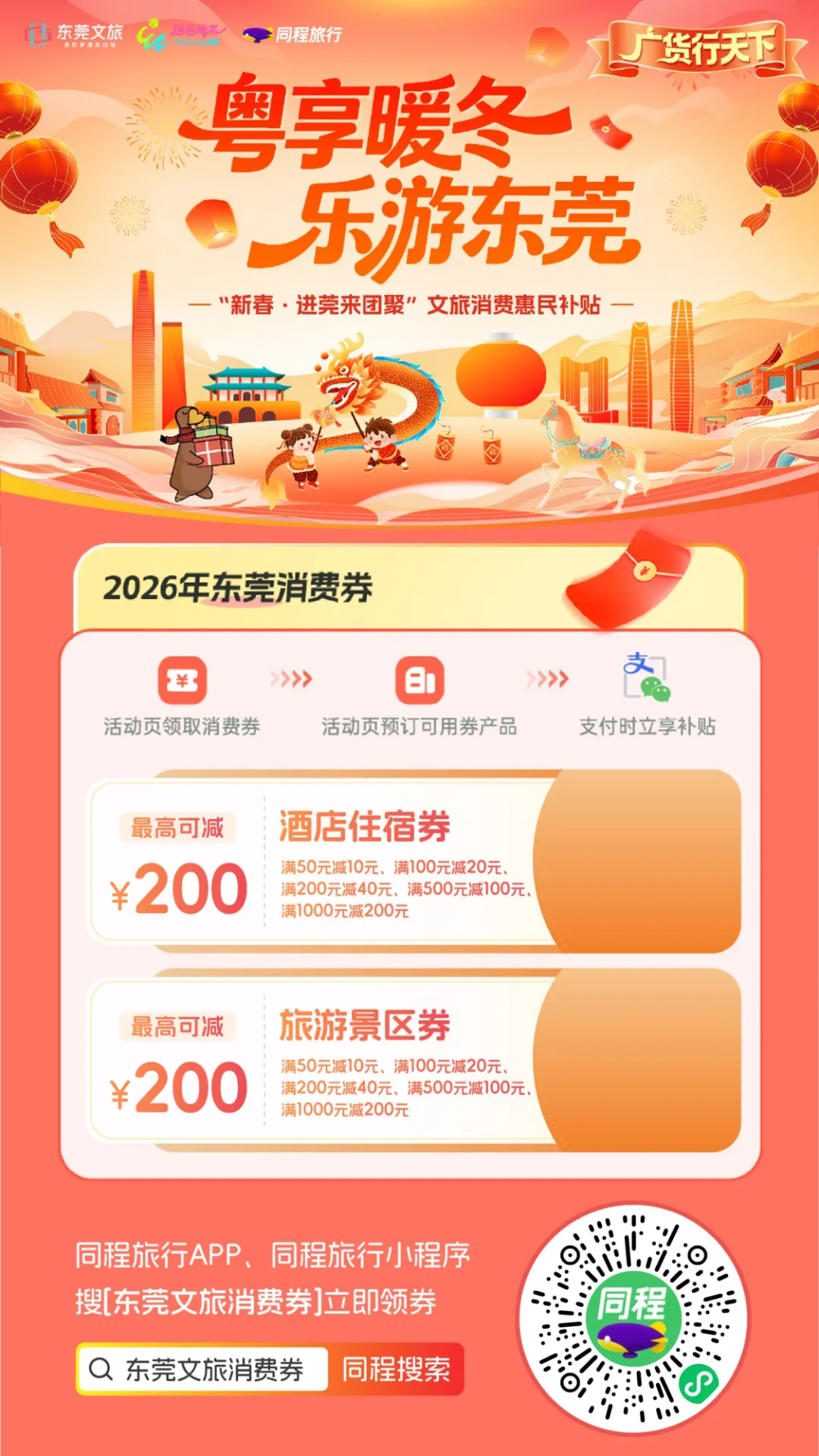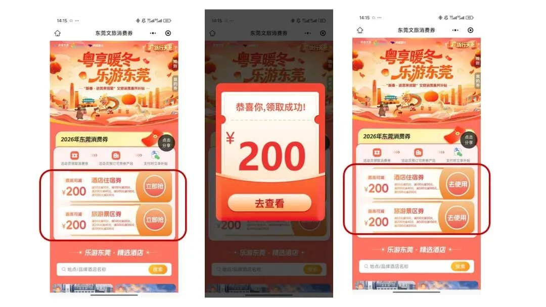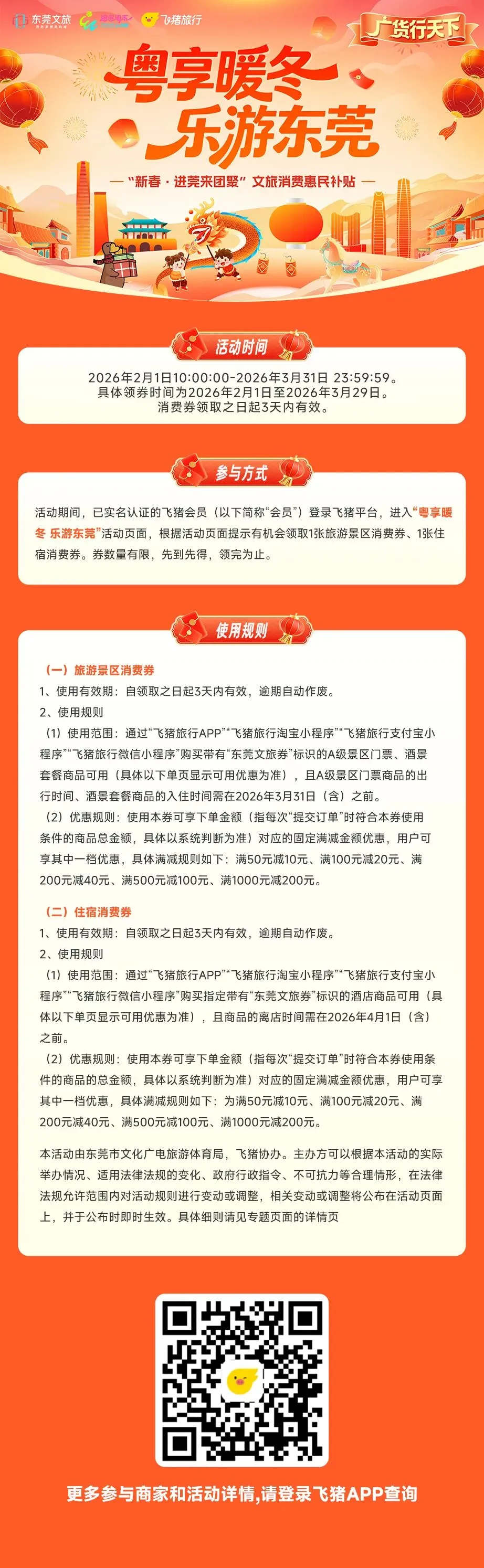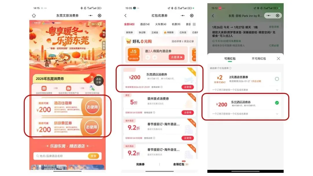 ②适用范围:本红包适用于抵扣平台在线售卖且支持用券的东莞市指定住宿产品,不叠加同类型政府满减优惠(如省文旅厅“请到广东过大年”文旅消费券),具体以实际下单情况为准;
