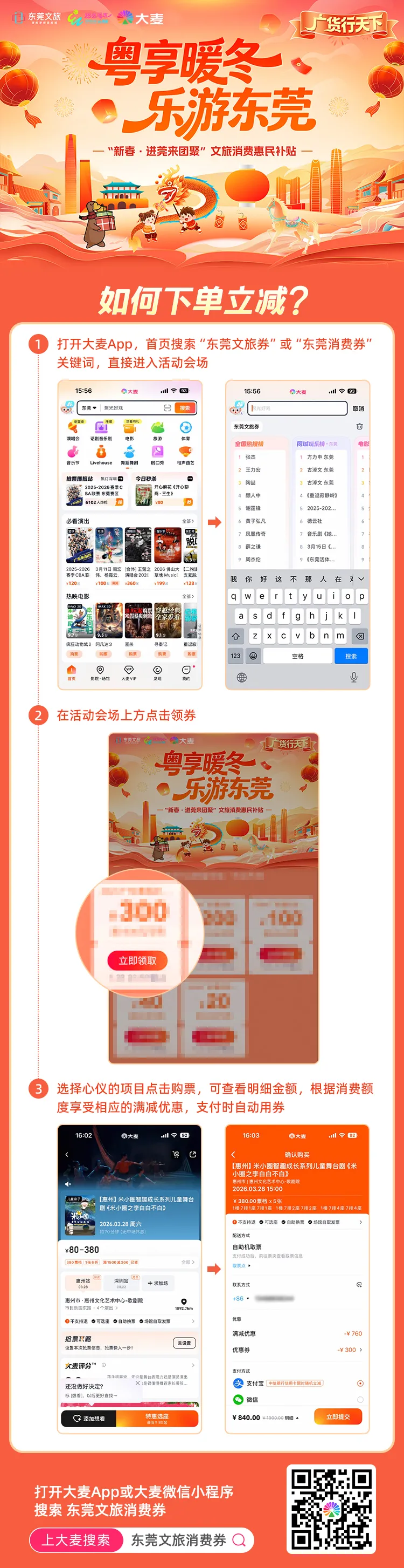 ②适用范围:本红包适用于抵扣平台在线售卖且支持用券的东莞市A级景区产品,不叠加同类型政府满减优惠(如省文旅厅“请到广东过大年”文旅消费券),具体以实际下单情况为准;