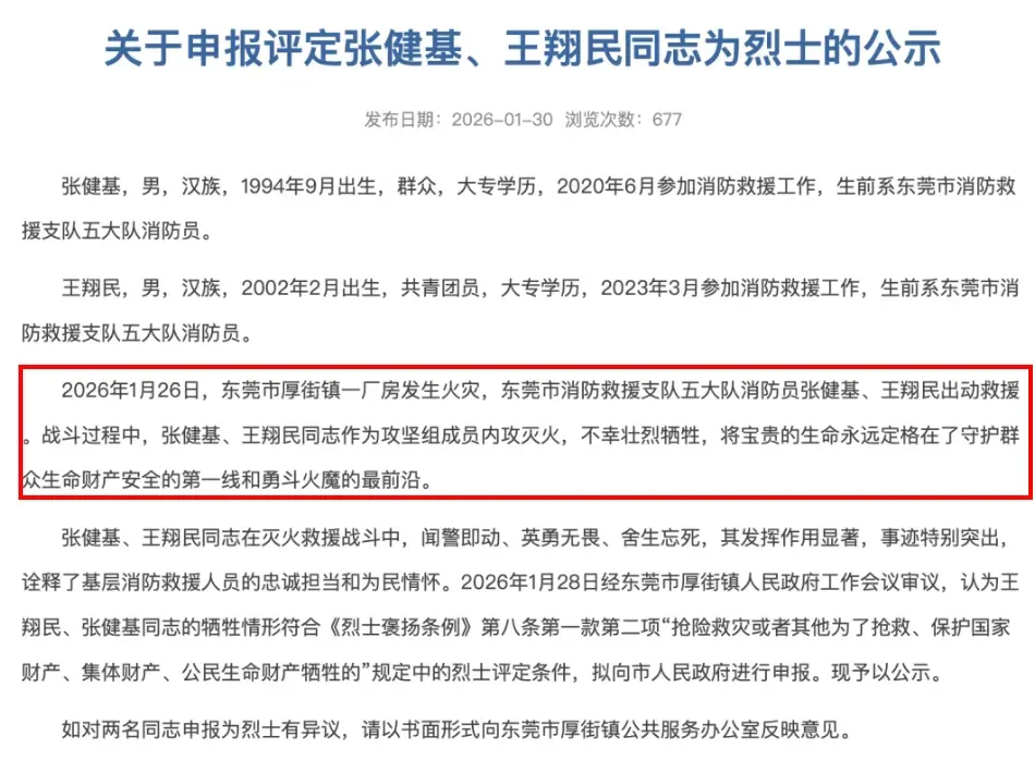 张健基、王翔民同志在灭火救援战斗中,闻警即动、英勇无畏、舍生忘死,其发挥作用显著,事迹特别突出,诠释了基层消防救援人员的忠诚担当和为民情怀。2026年1月28日经东莞市厚街镇人民政府工作会议审议,认为王翔民、张健基同志的牺牲情形符合《烈士褒扬条例》第八条第一款第二项“抢险救灾或者其他为了抢救、保护国家财产、集体财产、公民生命财产牺牲的”规定中的烈士评定条件,拟向市人民政府进行申报。现予以公示。