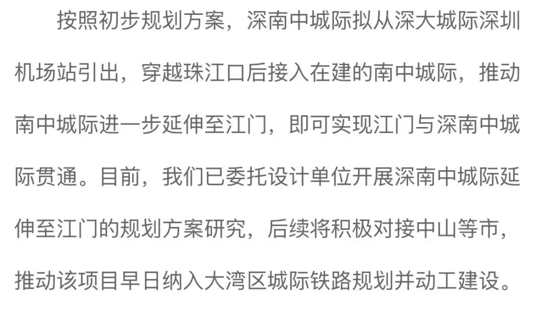 早前,在2024年江门市发改局已开展深南中城际延伸至江门方案研究。