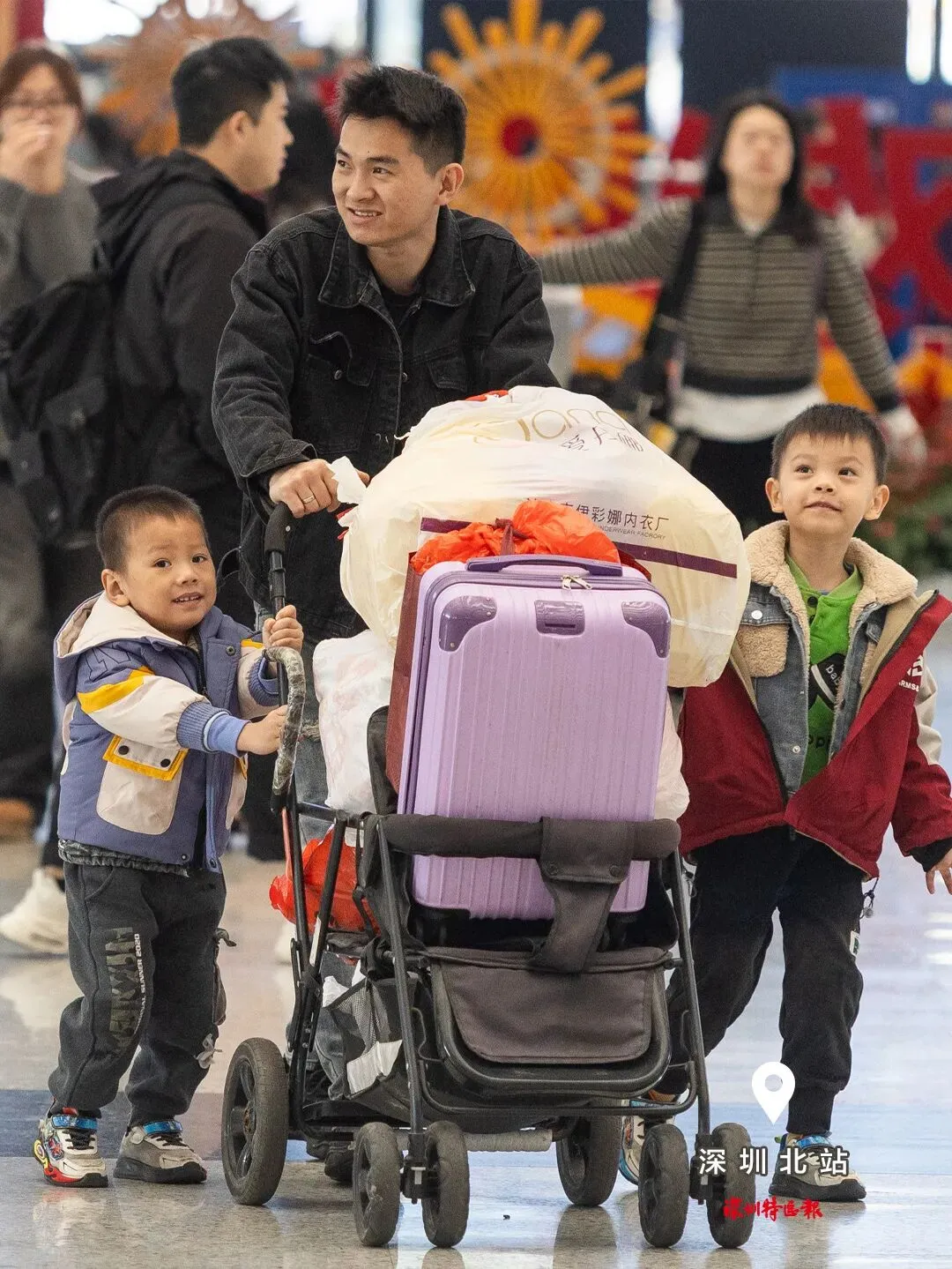 2026年铁路春运自2月2日开始,至3月13日结束,为期40天。深圳铁路部门预计发送旅客1213.5万人次,日均30.34万人次,同比增长7.5%,客流再创新高。图为一家人开开心心的推着堆满行李的婴儿车踏往返乡的旅程。(深圳特区报&读特记者 刘羽洁 摄)