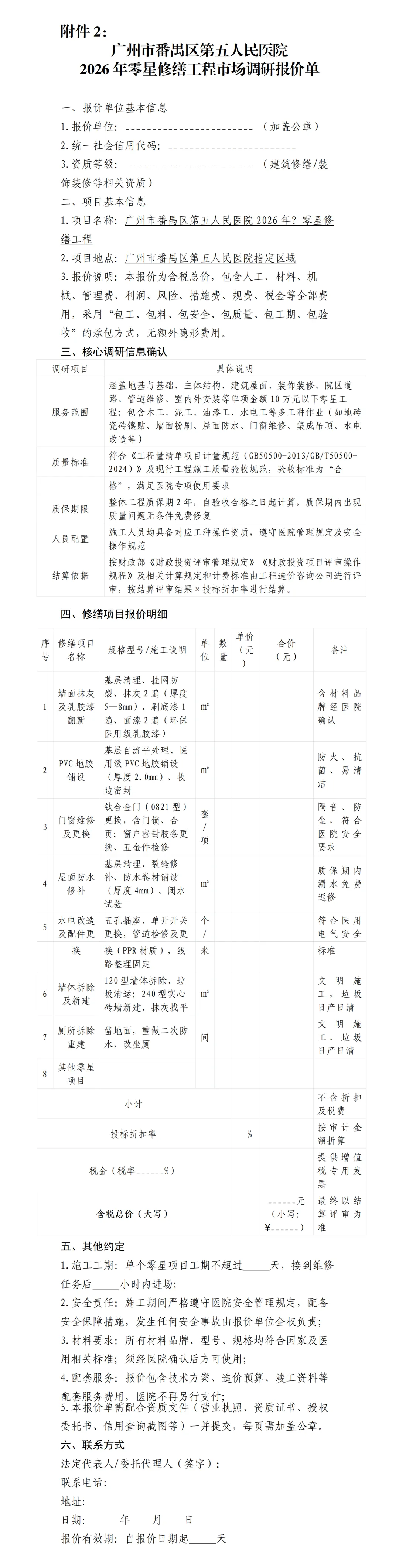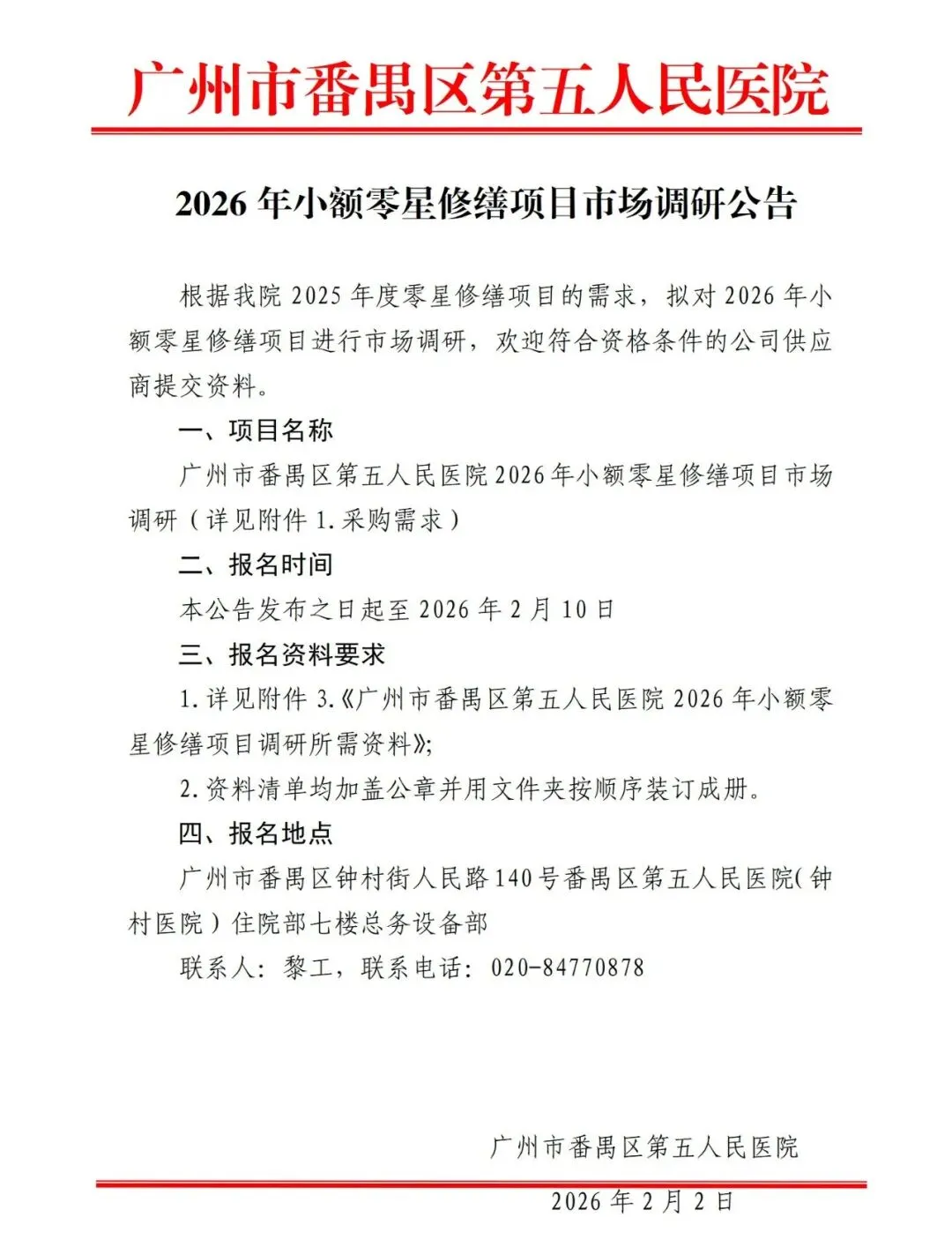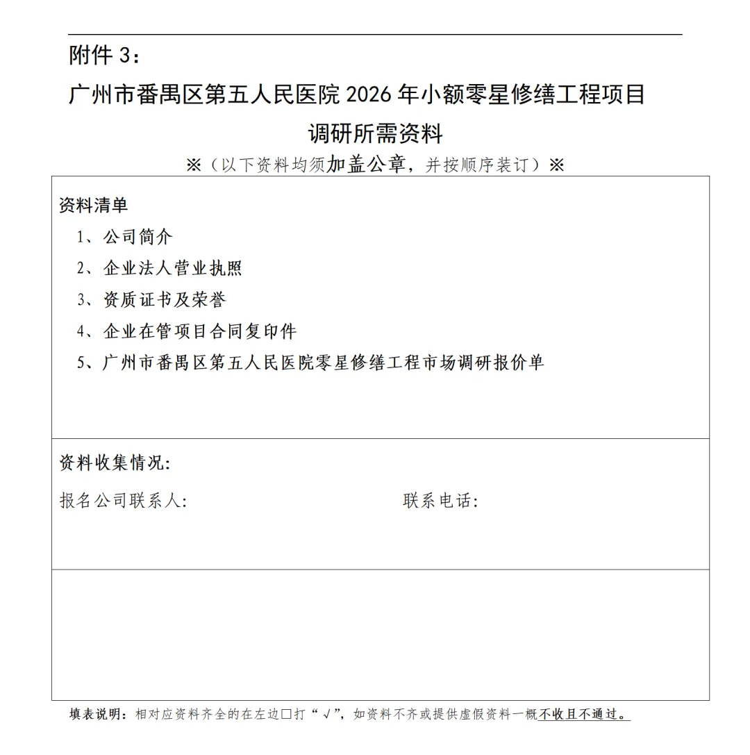 >广州市番禺区第五人民医院2026年小额零星修缮工程项目市场调研公告