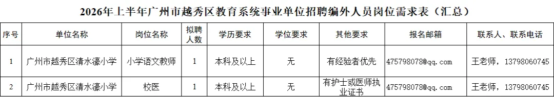 有意向的考生可直接与广州市越秀区清水濠小学联系,并将应聘材料发送到学校的报名邮箱,学校根据考生提供的材料进行资格审核。报名时间从公告发布之日起至2026年2月6日。如遇岗位报名人数比例不足1:2的,单位可视情况延长报名时间。
