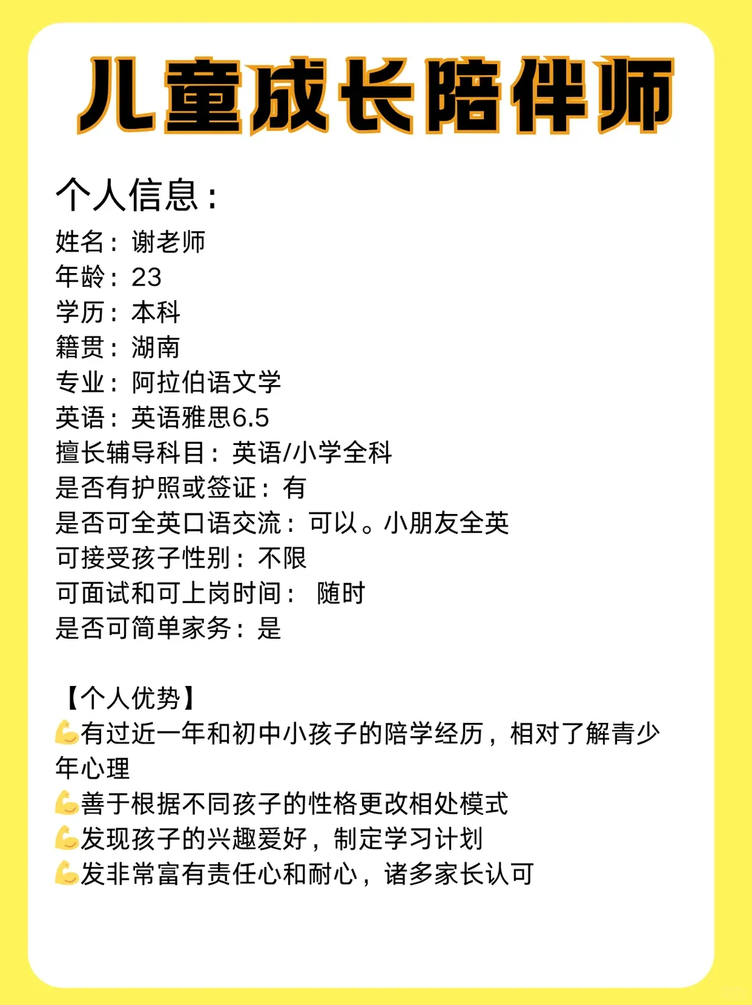 【个人优势】 心有过近一年和初中小孩子的陪学经历,相对了解青少 年心理 心善于根据不同孩子的性格更改相处模式发现孩子的兴趣爱好,制定学习计划6发非常富有责任心和耐心,诸多家长认可