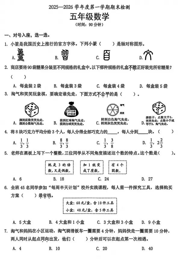 2026年深圳市南山区五年级上册数学期末试卷(第1页/共6页)