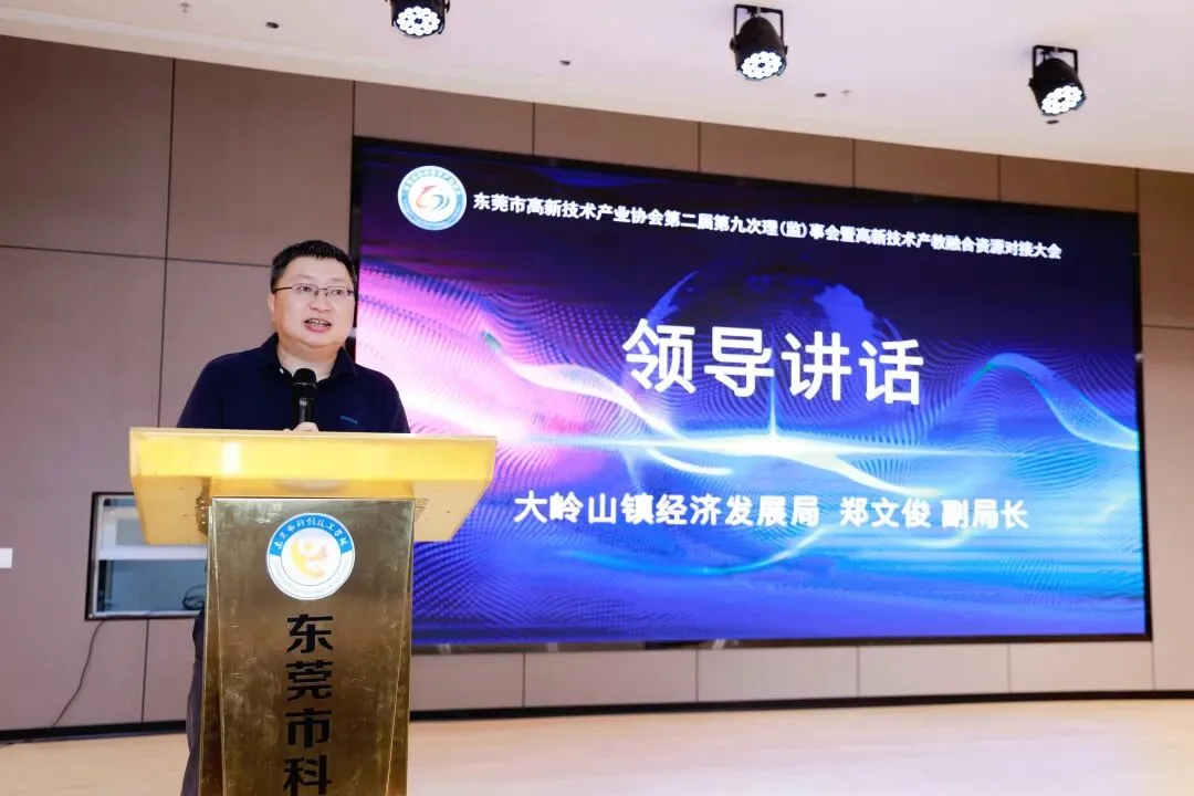 大岭山镇经济发展局副局长郑文俊代表副镇长黄志立(临时重要公务需出席)出席了本次会议,并发表讲话。郑文俊在发言中表示,大岭山镇作为东莞工业重镇,正以科技创新为引领,加速传统产业转型升级,积极培育电子信息、高端装备制造、新材料等新兴产业。他强调,产教融合是破解企业“用工难”与人才匹配问题的关键,未来将深化校企合作,推动产业链与教育链无缝衔接。大岭山镇将支持企业与院校共建实验室、定向培养技术人才,并鼓励企业参与产教融合。同时,结合镇内产业特点,重点发展智能机器人、新能源等领域,打造更具竞争力的产业集群。郑文俊充分肯定了东莞市高新技术产业协会在高企培育和产教融合中的桥梁作用,呼吁更多企业加入,共同构建“创新研发—人才培育—成果转化”的生态闭环,为大岭山及东莞高质量发展注入新动能。