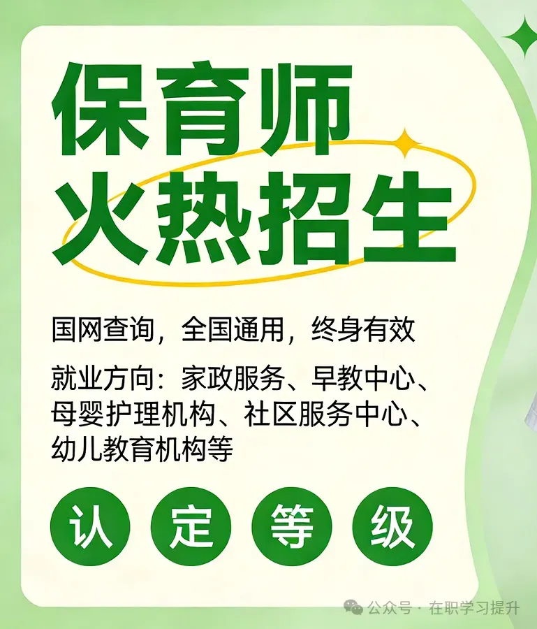 保育师不是“看孩子”那么简单,而是融合照护、教育、安全的专业岗位。一张证书,不仅是敲门砖,更是对孩子负责的承诺。如果你也像小A一样想转行、就业或提升自己,现在就是最好的开始!趁着春节假期,考一个证书,技多不压身!