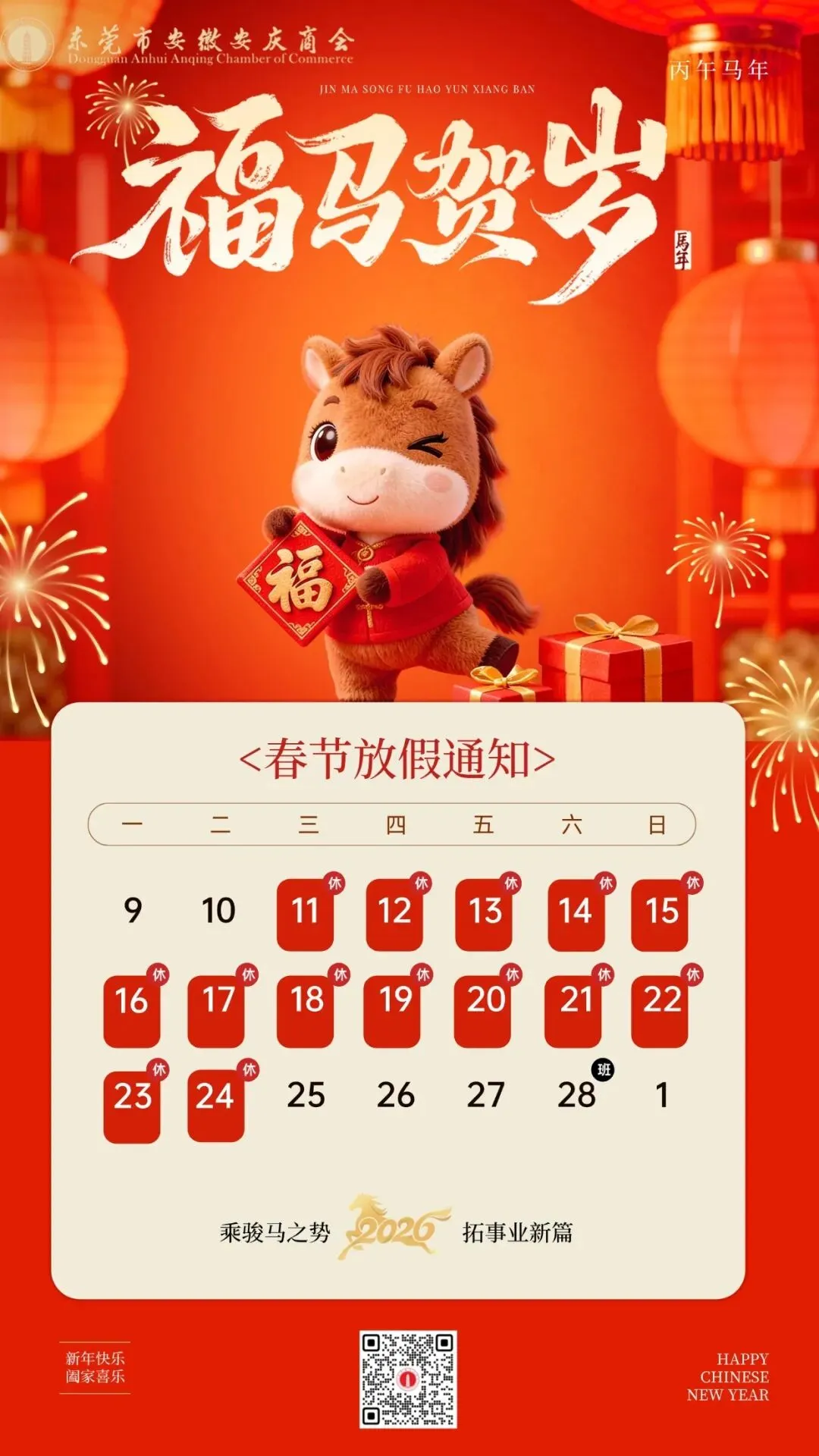 律回春渐,骏马奔腾。值此2026年农历马年新春佳节来临之际,东莞市安徽安庆商会谨向长期以来关心、支持商会发展的各级领导、各界贤达,以及全体会员同仁与家属,致以最诚挚的节日问候和最美好的新春祝福!祝愿大家在新的一年里:龙马精神,宏图大展;阖家安康,万事胜意!