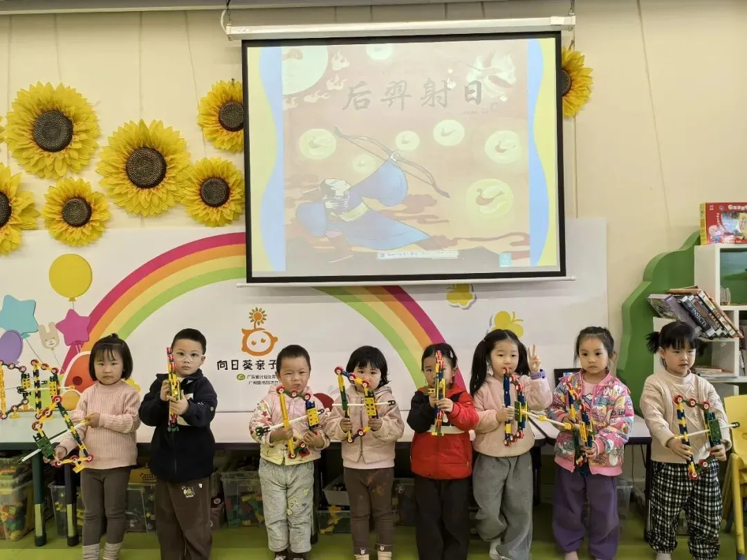 大圣老师分享了绘本故事《后羿射日》,故事里的十个太阳把大家都折磨得痛不欲生,就在这时,神箭手后羿挺身而出,他翻山越岭、跨过江河,站在东海之巅,“嗖嗖嗖”连射九箭,九个太阳像烟花一样“砰砰”炸开,最后留下一个乖乖上班的太阳,让万物重新生机勃勃!
