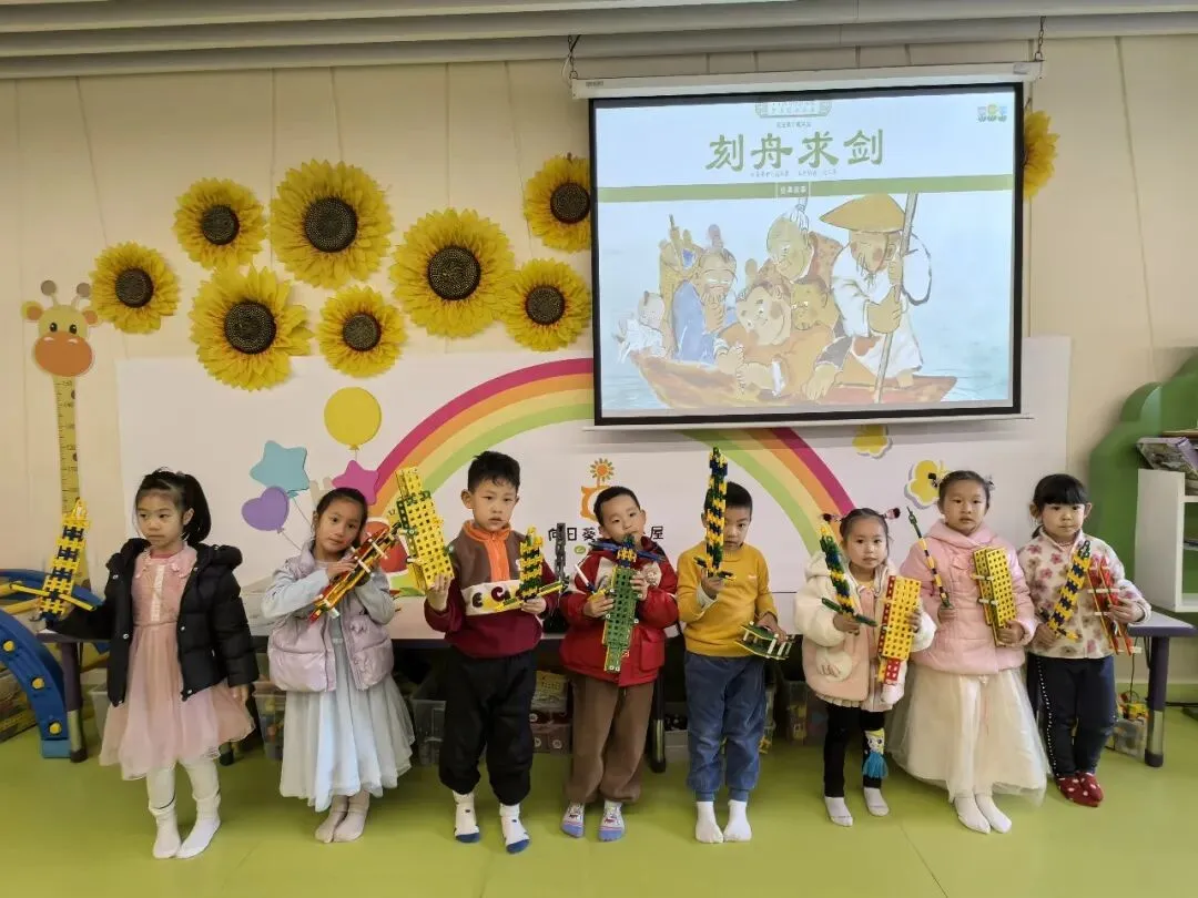 Amy老师分享了绘本故事《刻舟求剑》,故事里楚国到了岸边,他按记号下水捞剑,什么也没捞到。原来船在动,剑可不会跟着跑呀!小朋友们可不能像楚国人那样死守老办法,要懂得灵活变通,不同的问题用不同的解决方法。