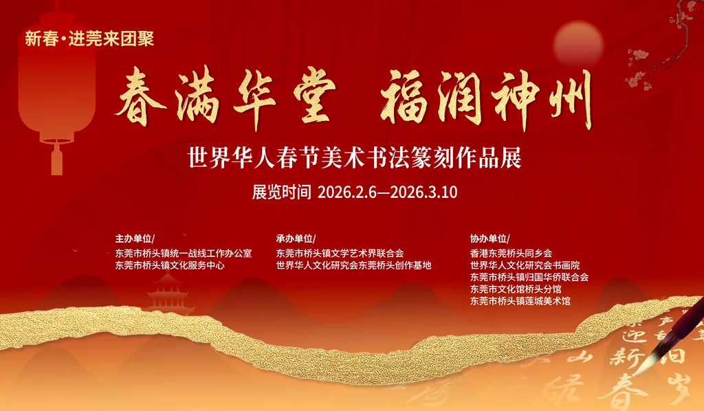 为传承中华优秀传统文化,抒发世界华人的思乡之情与团圆之愿,由东莞市桥头镇统一战线办公室、东莞市桥头镇文化服务中心联合主办“春满华堂·福润神州”世界华人春节美术书法篆刻作品展,诚邀海内外华人挥毫泼墨、执刀刻石,以艺术之名定格春节之美,以文化之桥联结故土之情,让千年年味在笔墨金石间生生不息,让中华文脉在世界舞台上薪火相传。