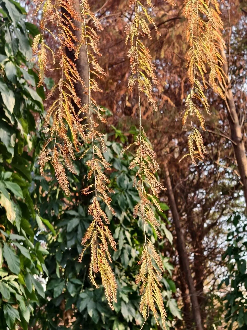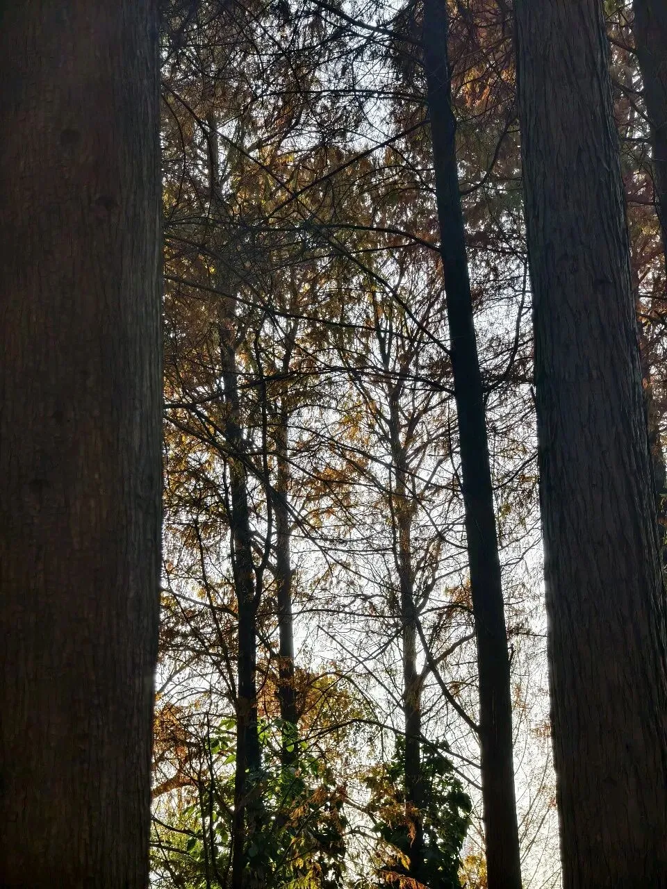 我们先来到一片远离湖边的落羽杉林,约莫百米长、二十米宽,宛如一片小小的焦糖色秘境。