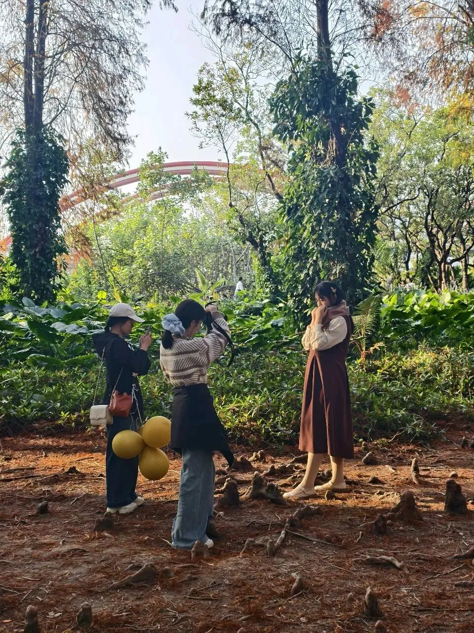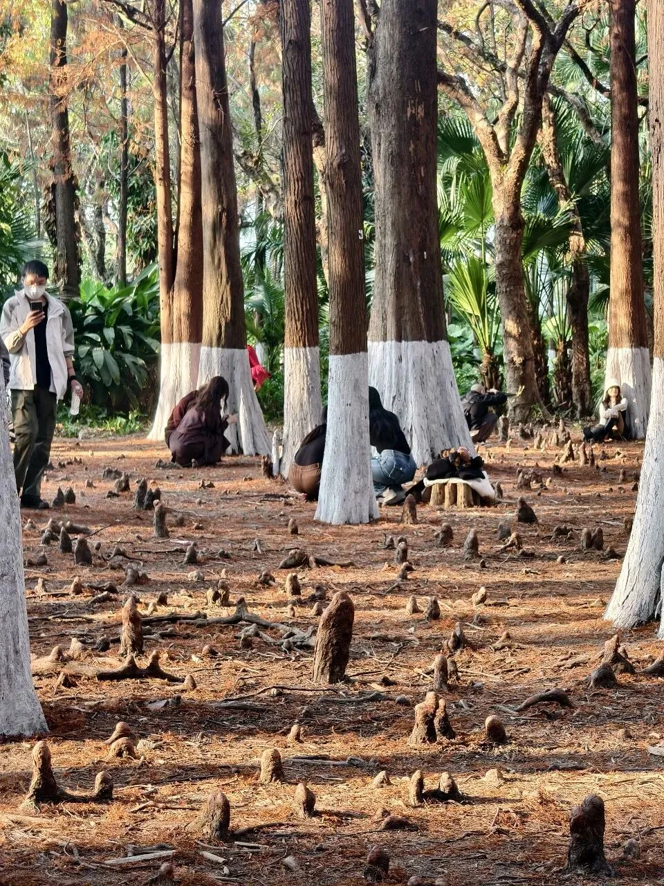我随手按下快门,拍高耸入云的杉树与湛蓝的天空同框,拍林间拍照的人群,拍蹲在地上认真玩石子的孩子,拍地面上形似石笋的根茎,每一张照片,都藏着不刻意的美好。这份不刻意的治愈,便是杉林最好的馈赠。