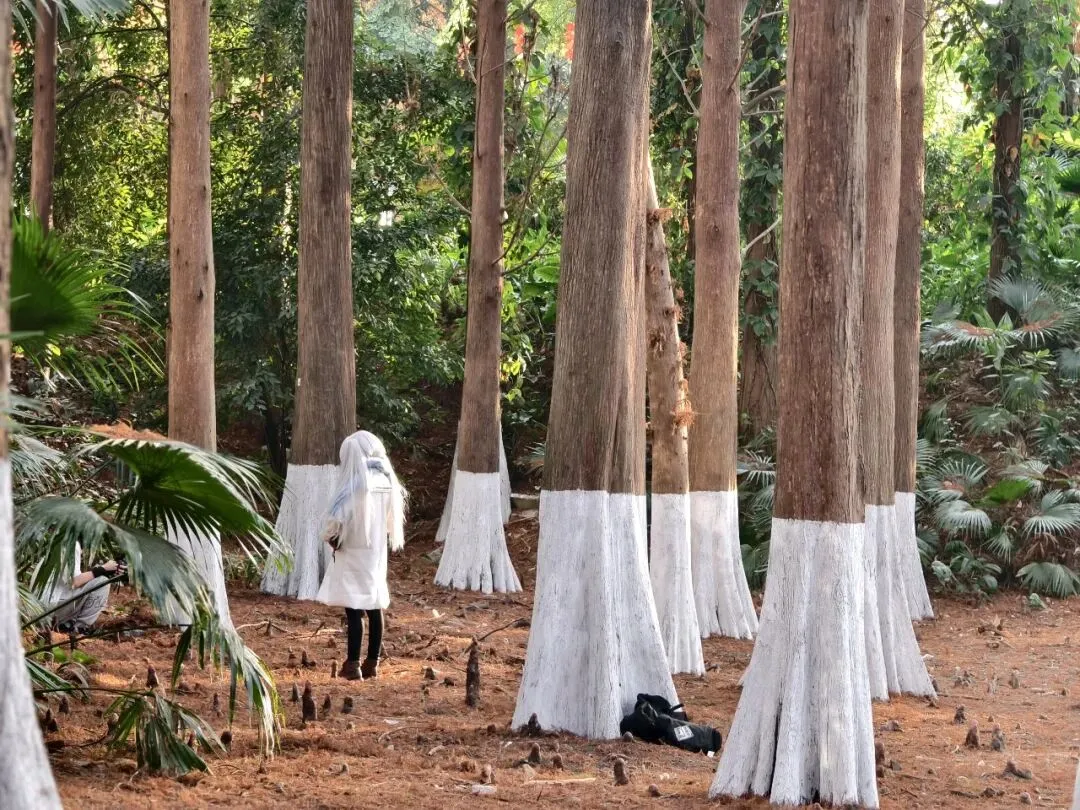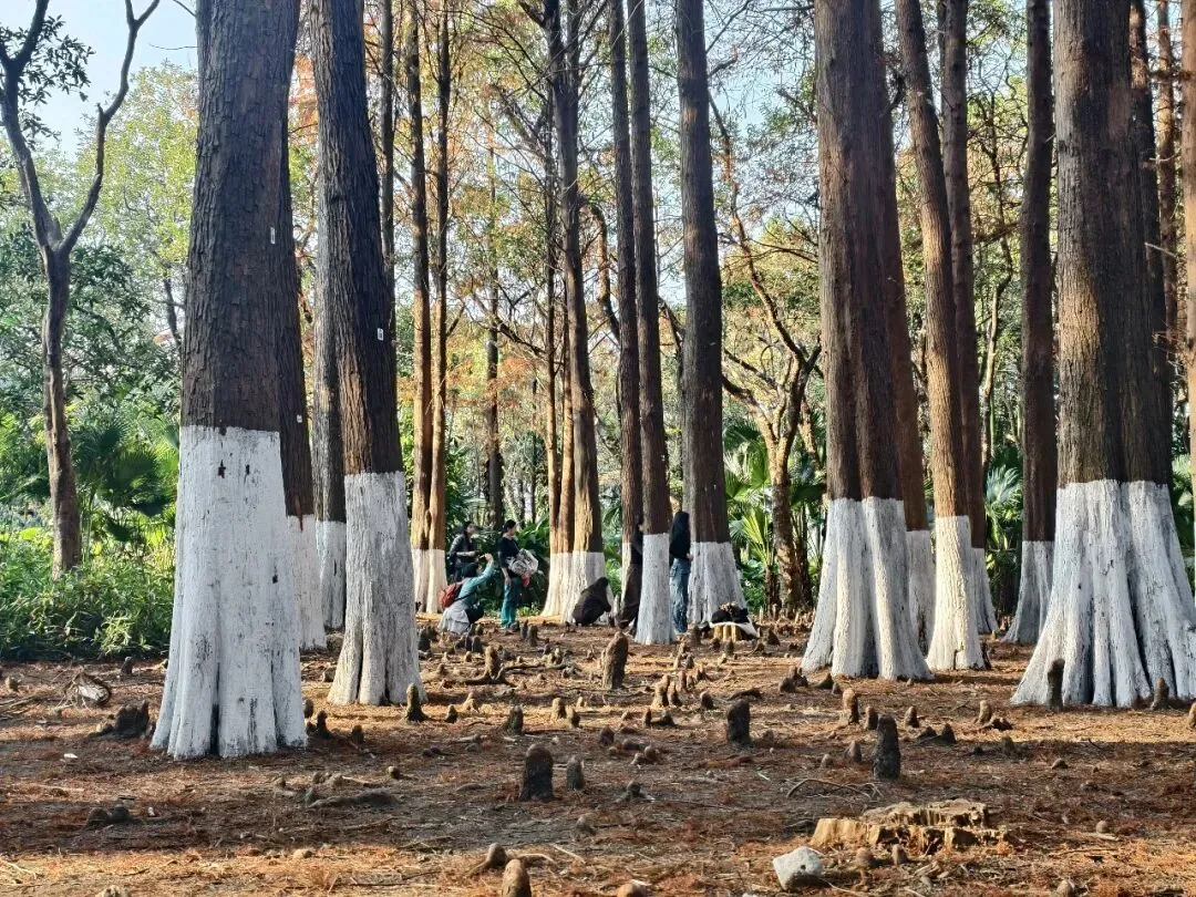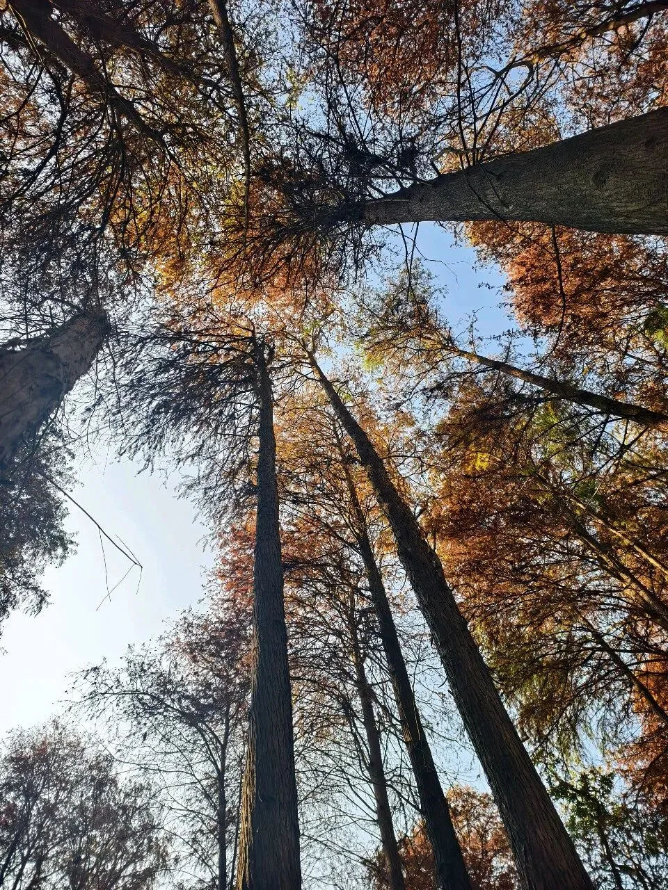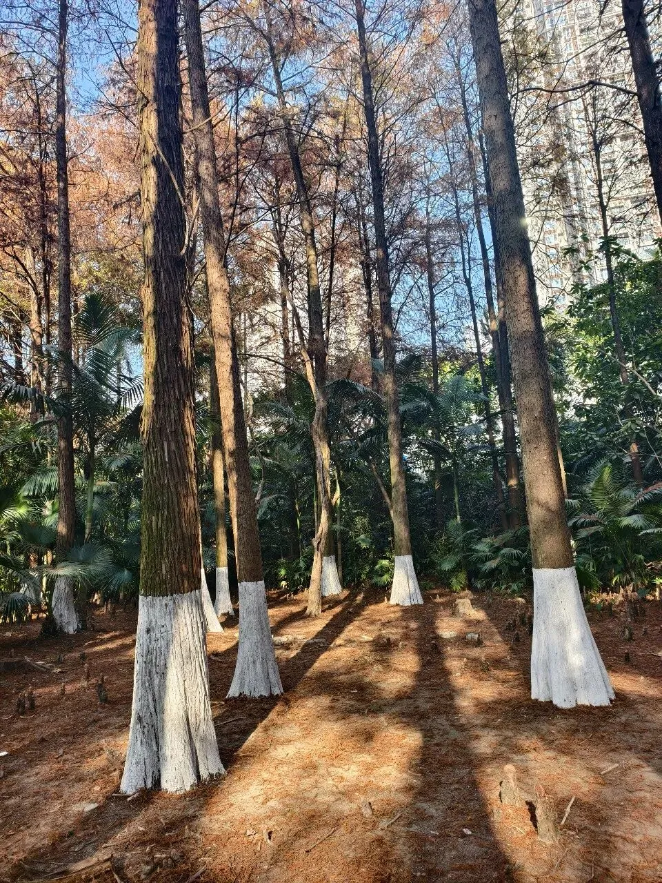 每一棵落羽杉都高耸笔直,挺拔向上,根部一米左右的地方涂着白色“袜子”,在焦糖色枝叶的映衬下,更显雅致。