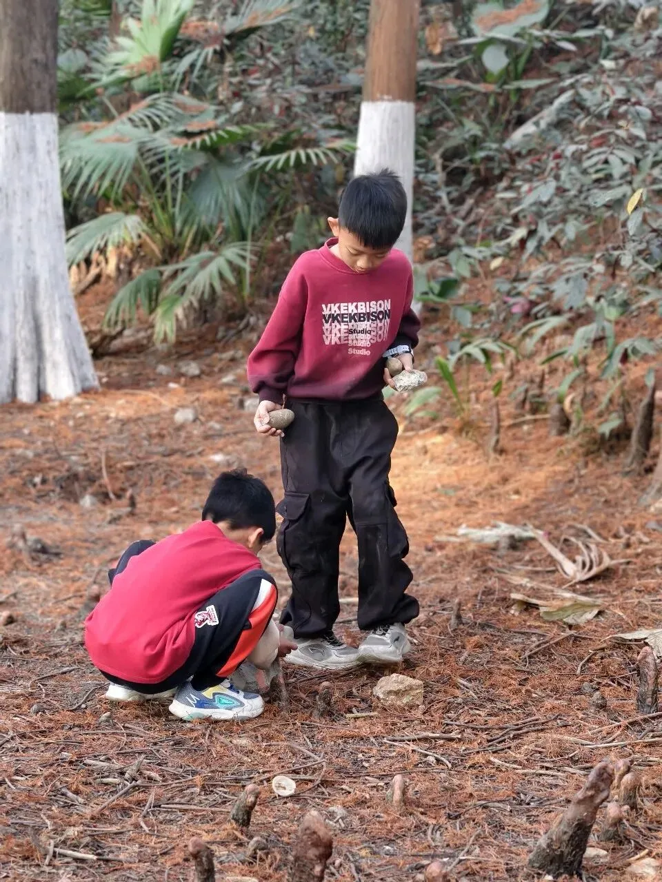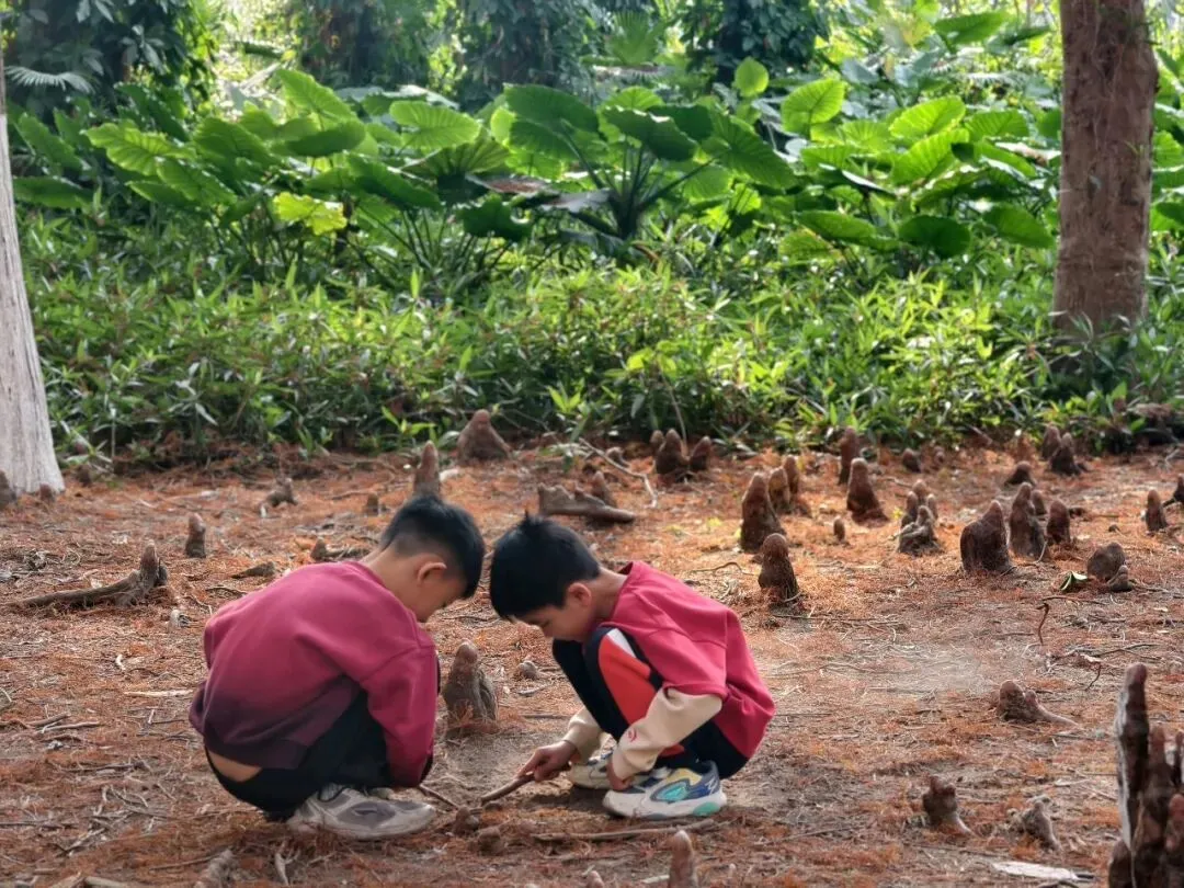 孩子很快被这片天地吸引,一个大一点的男孩牵头,两个小家伙凑在一起捡石头、玩“挖矿”游戏,清脆的笑声回荡在林间,驱散了所有的阴霾。