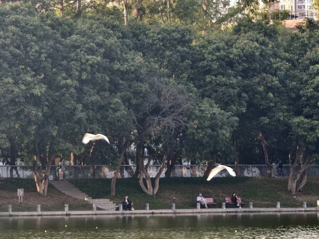 几棵落羽杉伫立在水中,树干底部粗壮挺拔,稳稳扎根在湖底,旁边用带链子的石柱围起,供游人驻足观景、拍照留念。恰逢阳光正好,暖融融的光线洒在湖面,波光粼粼,就在这时,两只白鹭掠过湖面,姿态轻盈,紧接着,又有三只白鹭翩然而至,五只白鹭相对而飞,成为湖面最灵动的风景。