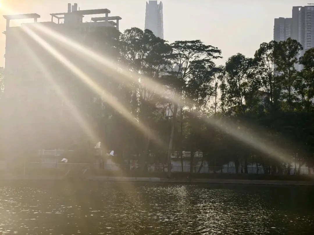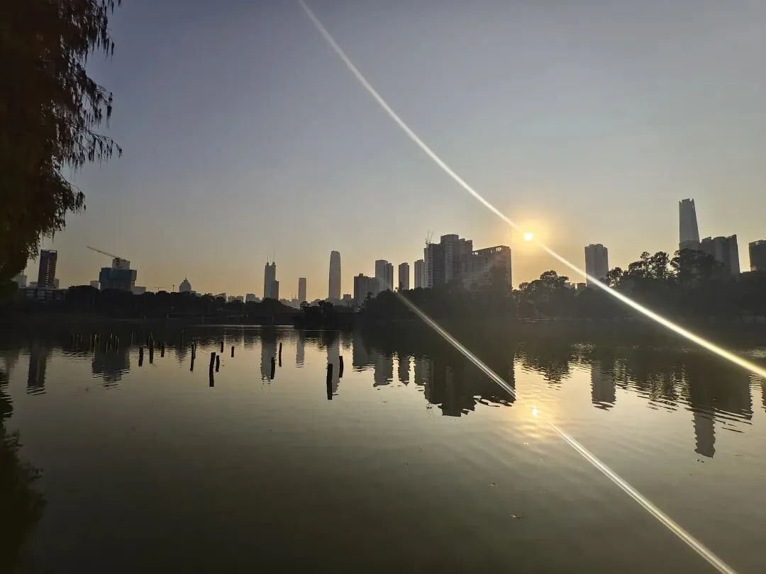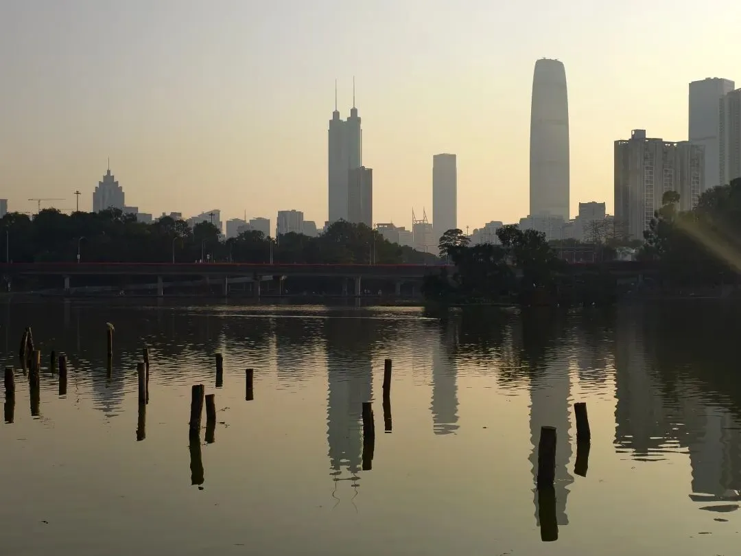抬眼望去,左手边便是地王大厦的方向,钢筋水泥铸就的城市森林,清晰地倒映在平静的湖面上,硬朗的建筑线条与柔软的杉影、灵动的飞鸟相映成趣,让这片湖面更添几分层次感。湖面格外静谧,偶尔有微风拂过,泛起层层涟漪,将倒影揉碎,又缓缓拼凑,美得恰到好处。