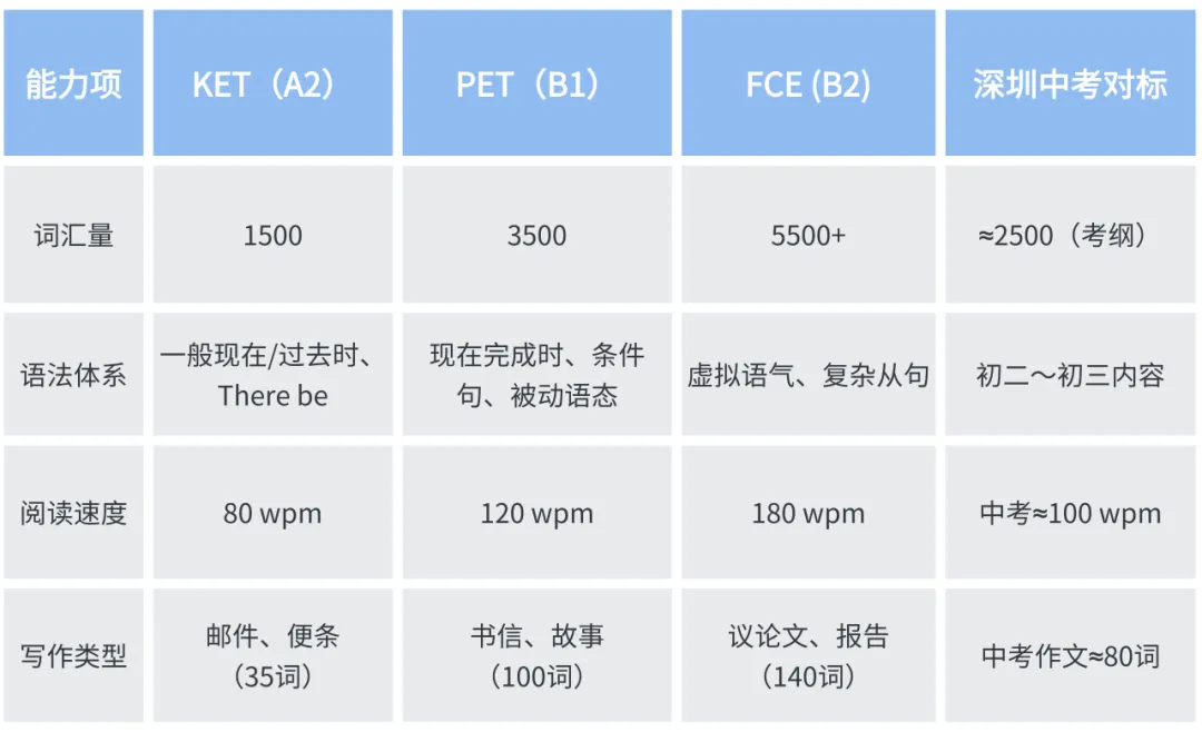 深圳小升初虽不直接考剑桥内容,但初中英语教学进度极快。以深圳某重点初中为例,初一上学期就要求掌握被动语态、情态动词完成式等PET语法点,阅读材料平均长度达300词,远超小学课本。那些没有剑桥基础的学生,往往在初一第一次月考就遭遇“滑铁卢”,从此对英语失去信心。