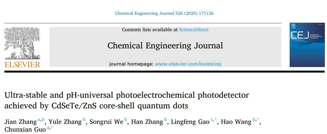 2025年11月,苏州科技大学郭春显教授、深圳大学张晗教授与杭州师范大学高凌峰副教授合作,在《Chemical Engineering Journal》上发表了关于pH普适、超稳定光电化学光电探测器的最新研究成果。该工作通过合成CdSeTe/ZnS核壳量子点,构建了能够在极端酸碱环境中稳定工作的高性能探测器,为克服镉基材料的酸性水解问题提供了具体示例。论文第一作者为苏州科技大学青年老师张健。